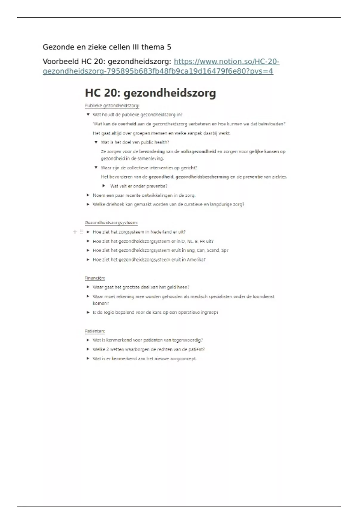 Dit document bevat de volledige aantekeningen en uitwerkingen in de vorm van oefenvragen (zie link voorbeeld hoorcollege) van: HC 20: gezondheidszorg, HC 21: public health, HC 22: cultuursensitief werken in de zorg en wetenschap, HC 23: verzekeringsgeneeskunde, HC 24: bedrijfsarts, HC 25: rol van de huisarts, HC 26: secundaire preventie screening, HC 27: bevolkingsonderzoek, HC 28: oncologische revalidatie, HC 29: pijn bij kanker en HC 30: palliatieve zorg. Ook zit de werkcollege revalidatiegeneeskunde erbij. Onze tentamen hebben we hiermee makkelijk gehaald. Onze aantekeningen bevatten alle informatie van de hoorcolleges en werkgroepen, en zijn omgezet in handige overhoorvragen. Hiermee kun je de stof meteen actief leren. Meerdere studiegenoten hebben gebruik gemaakt van deze notion. Graag niet de link doorsturen!