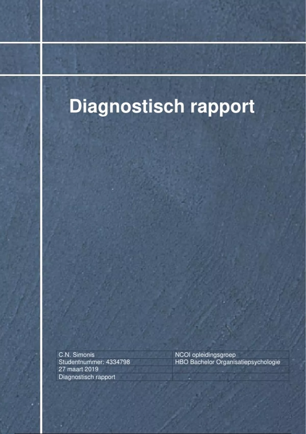 Dit diagnostische rapport is opgesteld in het kader van de examenopdracht voor de modulen Psychologisch onderzoek en Diagnostiek. Het betreft een diagnose naar burn-out en advies ter herstel.