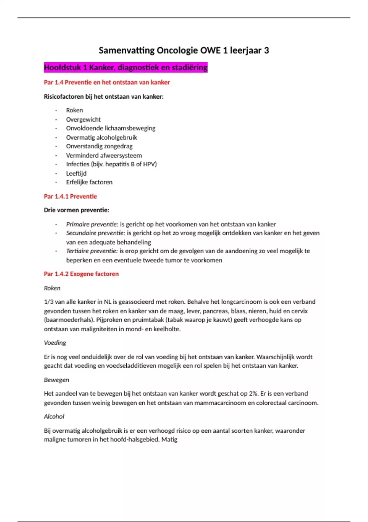 Samenvatting Oncologie OWE 1 leerjaar 3