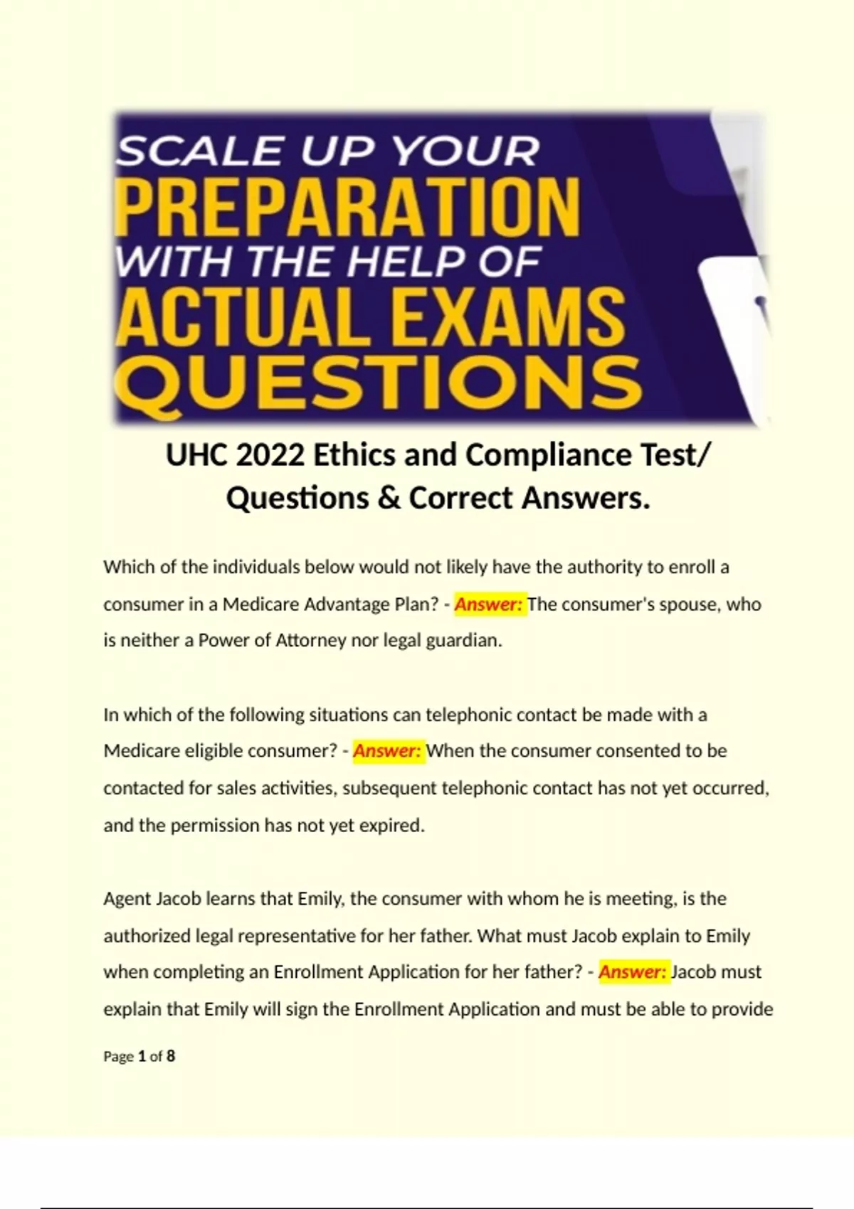 UHC 2022 Ethics and Compliance Test/ Questions & Correct Answers. Which of the individuals below would not likely have the authority to enroll a consumer in a Medicare Advantage Plan? - Answer: The consumer's spouse, who is neither a Power of Attorney nor legal guardian. In which of the following situations can telephonic contact be made with a Medicare eligible consumer? - Answer: When the consumer consented to be contacted for sales activities, subsequent telephonic contact has not yet occurred, and the permission has not yet expired. Agent Jacob learns that Emily, the consumer with whom he is meeting, is the authorized legal representative for her father. What must Jacob explain to Emily when completing an Enrollment Application for her father? - Answer: Jacob must explain that Emily will sign the Enrollment Application and must be able to provide documentation upon request by the Plan that indicates her legal authority to enroll her father. Which of the following must you not do when marketing UnitedHealthcare Medicare Advantage or Prescription Drug Plans to consumers? - Answer: Provide only those items from the plan's Enrollment Guide that are most relevant to the consumer's situation.