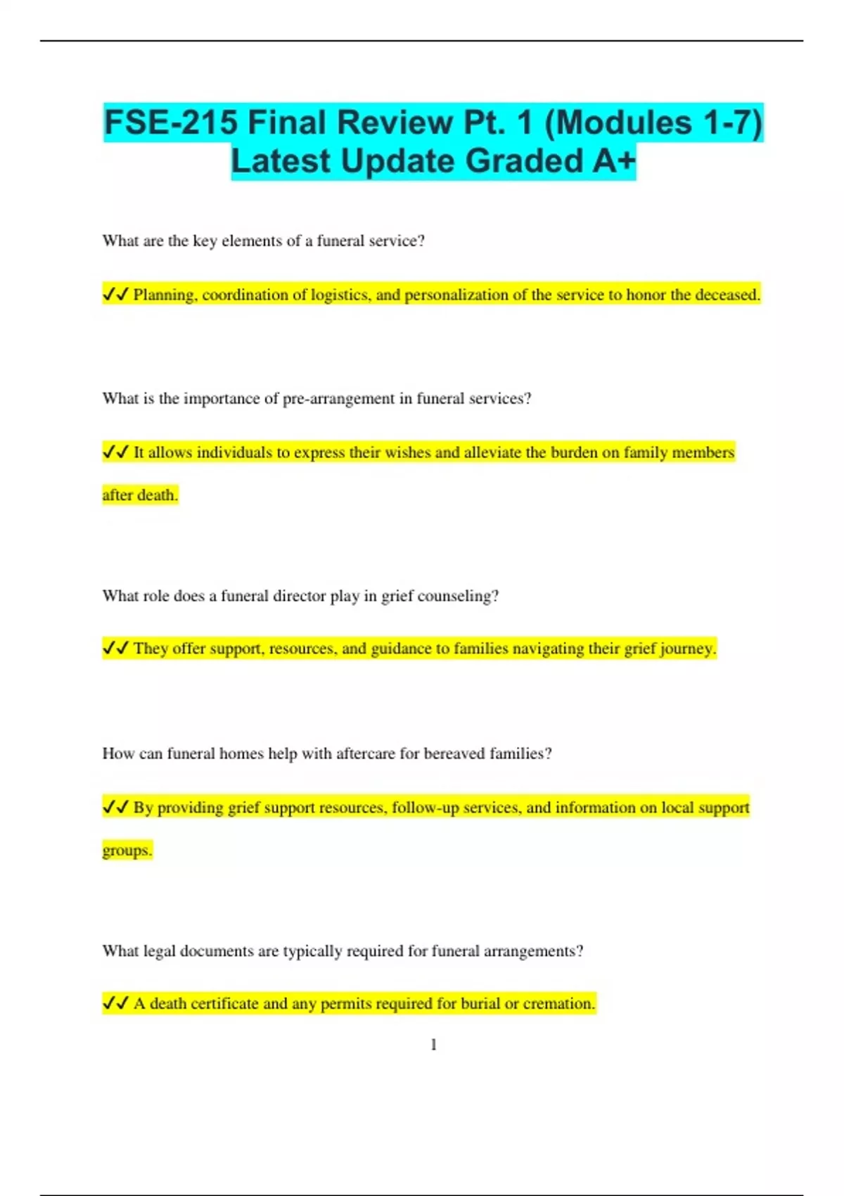 FSE-215 Final Review Pt. 1 (Modules 1-7) Latest Update Graded A+ What are the key elements of a funeral service? Planning, coordination of logistics, and personalization of the service to honor the deceased. What is the importance of pre-arrangement in funeral services? It allows individuals to express their wishes and alleviate the burden on family members after death. What role does a funeral director play in grief counseling? They offer support, resources, and guidance to families navigating their grief journey. How can funeral homes help with aftercare for bereaved families? By providing grief support resources, follow-up services, and information on local support groups. What legal documents are typically required for funeral arrangements? A death certificate and any permits required for burial or cremation. 2 How do funeral homes maintain a respectful environment for services? By ensuring cleanliness, organization, and a peaceful atmosphere in the facilities. What is the significance of a funeral service to the grieving process? It provides an opportunity for families and friends to gather, share memories, and begin healing together. How does effective communication enhance funeral service delivery? It ensures that families receive accurate information and feel supported throughout the planning process. What is the role of technology in modern funeral services? It can enhance communication, streamline operations, and provide online memorial options for families. How can funeral homes honor diverse cultural practices? By being respectful and accommodating to various traditions and customs related to death and mourning. 3 What are some common types of memorial services offered by funeral homes? Traditional funerals, memorial services, and celebration of life ceremonies. How does the funeral home’s layout impact family experience? A thoughtful layout can create a welcoming