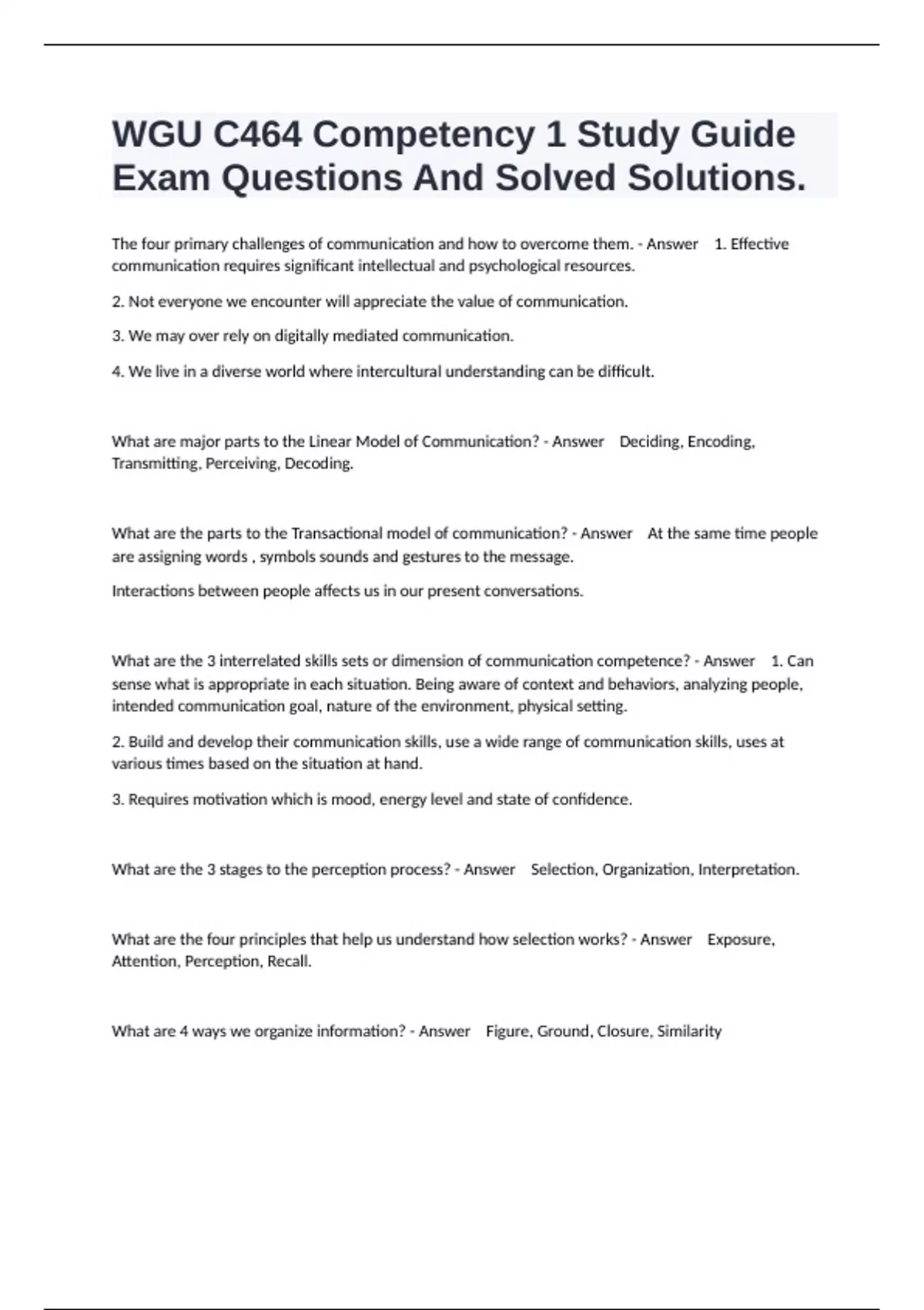 The four primary challenges of communication and how to overcome them. - Answer 1. Effective communication requires significant intellectual and psychological resources. 2. Not everyone we encounter will appreciate the value of communication. 3. We may over rely on digitally mediated communication. 4. We live in a diverse world where intercultural understanding can be difficult. What are major parts to the Linear Model of Communication? - Answer Deciding, Encoding, Transmitting, Perceiving, Decoding. What are the parts to the Transactional model of communication? - Answer At the same time people are assigning words , symbols sounds and gestures to the message. Interactions between people affects us in our present conversations. What are the 3 interrelated skills sets or dimension of communication competence? - Answer 1. Can sense what is appropriate in each situation. Being aware of context and behaviors, analyzing people, intended communication goal, nature of the environment, physical setting. 2. Build and develop their communication skills, use a wide range of communication skills, uses at various times based on the situation at hand. 3. Requires motivation which is mood, energy level and state of confidence. What are the 3 stages to the perception process? - Answer Selection, Organization, Interpretation. What are the four principles that help us understand how selection works? - Answer Exposure, Attention, Perception, Recall. What are 4 ways we organize information? - Answer Figure, Ground, Closure, Similarity
