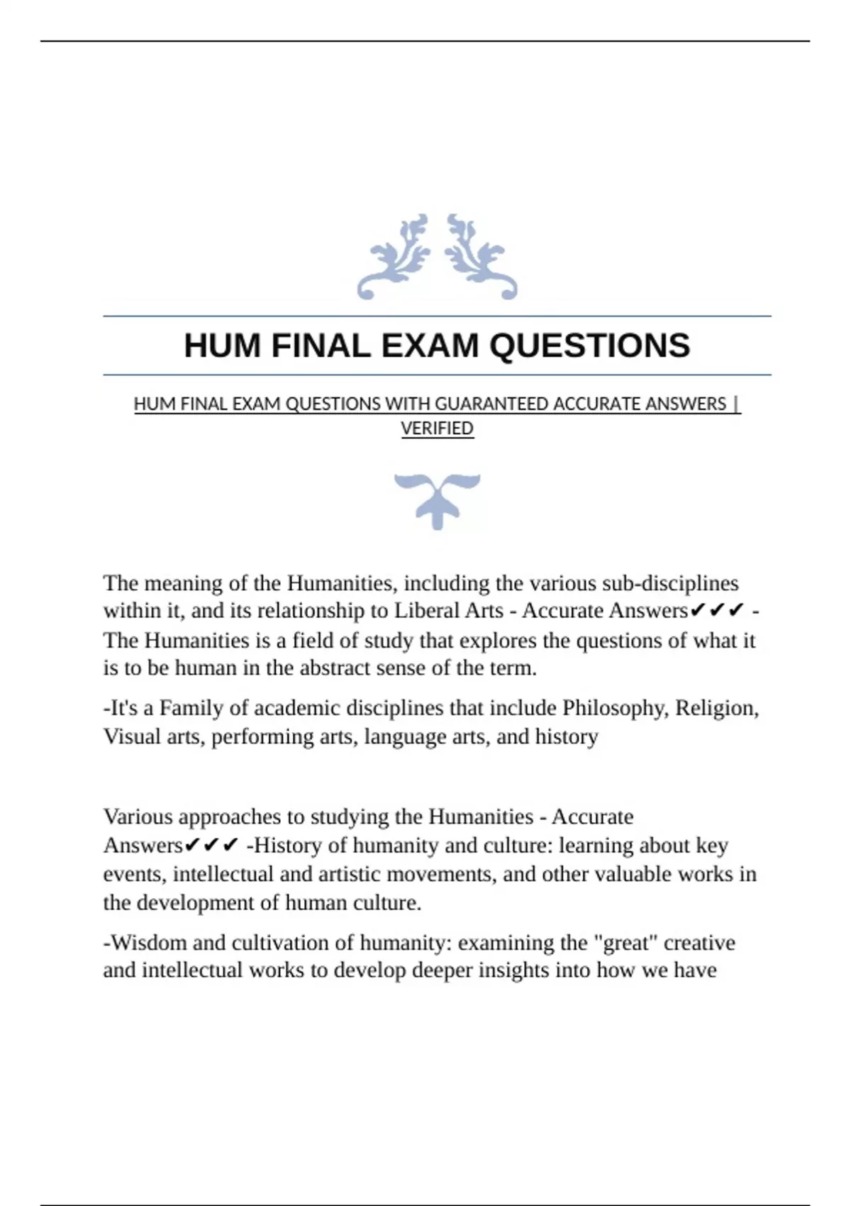 HUM FINAL EXAM QUESTIONS WITH GUARANTEED ACCURATE ANSWERS |