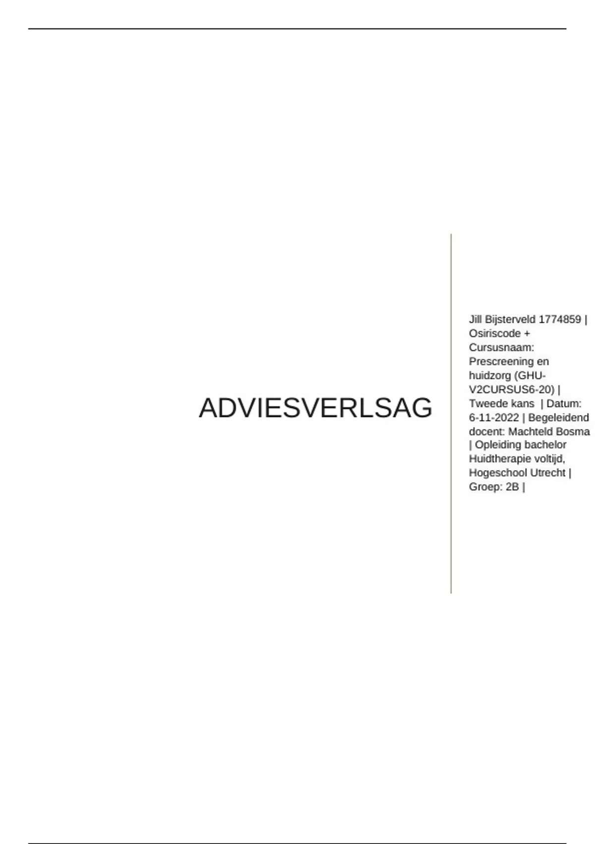 Een verslag geschreven door een huidtherapie student. Het is de cursus Prescreening en huidzorg van het tweede leerjaar. In het verslag staan verschillende huidaandoeningen beschreven met product advies.