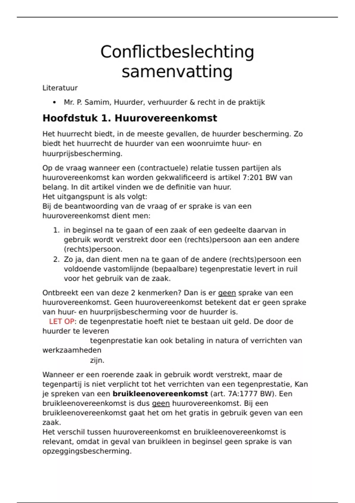 Het is een volledige samenvatting voor de kennistoets van Conflictbeslechting jaar 2 blok 1 opleiding SJD (aan de HvA). In de samenvatting heb ik de gehele stof, die nodig is voor het tentamen, uit het boek Huurder, verhuurder & recht in de praktijk samengevat. Daarnaast heb ik ook de flitscolleges die wij hebben gekregen volledig uitgewerkt en ook zijn in dit document de leerdoelen volledig uitgewerkt.