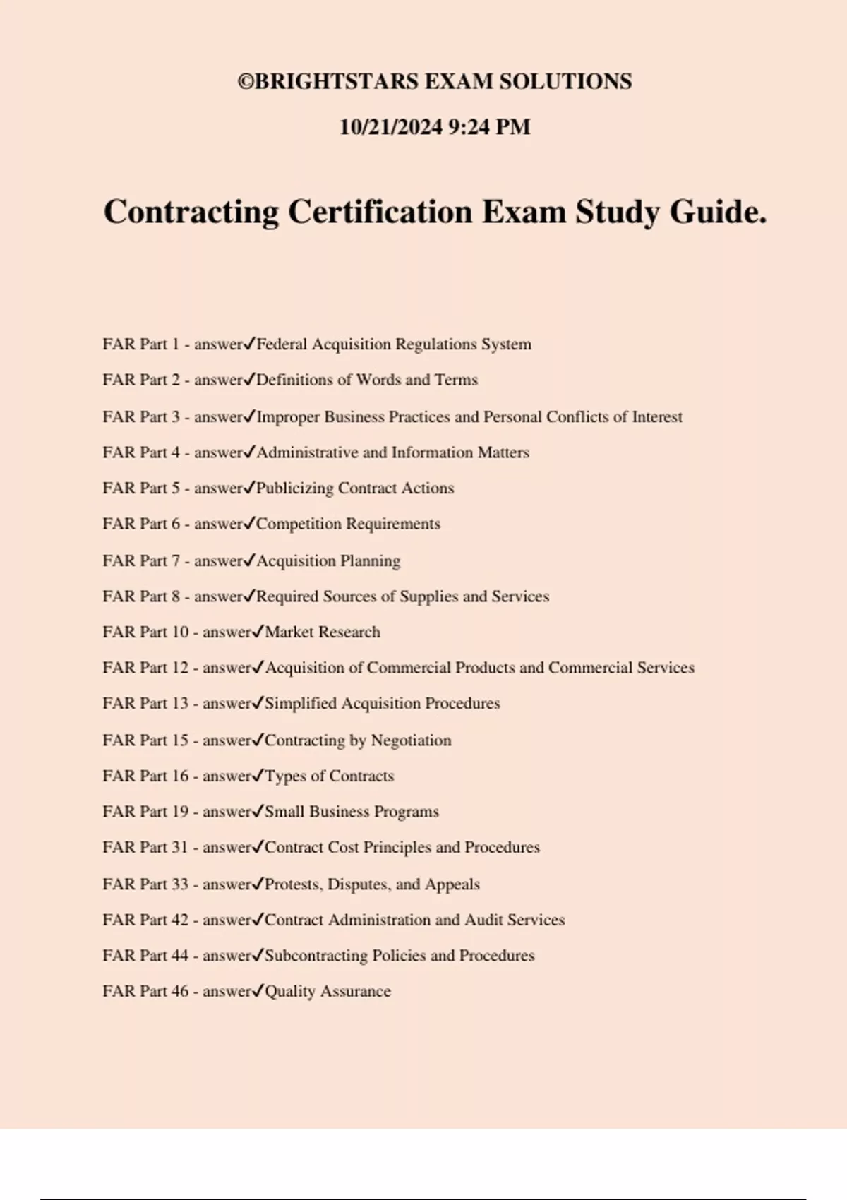 Contracting Certification Exam Study Guide. FAR Part 1 - answerFederal Acquisition Regulations System FAR Part 2 - answerDefinitions of Words and Terms FAR Part 3 - answerImproper Business Practices and Personal Conflicts of Interest FAR Part 4 - answerAdministrative and Information Matters FAR Part 5 - answerPublicizing Contract Actions FAR Part 6 - answerCompetition Requirements FAR Part 7 - answerAcquisition Planning FAR Part 8 - answerRequired Sources of Supplies and Services FAR Part 10 - answerMarket Research FAR Part 12 - answerAcquisition of Commercial Products and Commercial Services FAR Part 13 - answerSimplified Acquisition Procedures FAR Part 15 - answerContracting by Negotiation FAR Part 16 - answerTypes of Contracts FAR Part 19 - answerSmall Business Programs FAR Part 31 - answerContract Cost Principles and Procedures FAR Part 33 - answerProtests, Disputes, and Appeals FAR Part 42 - answerContract Administration and Audit Services FAR Part 44 - answerSubcontracting Policies and Procedures FAR Part 46 - answerQuality Assurance