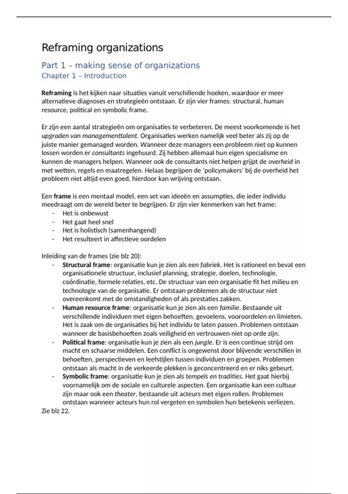 Nederlandse samenvatting van het boek reframing organizations van Bolman en Deal. 6de druk. H1 t/m 14. Dus intro + alle frames.