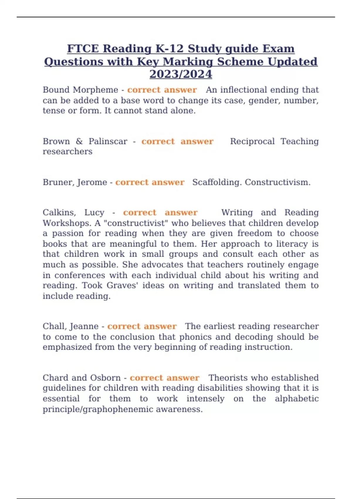 FTCE Reading K-12 Study guide Exam Questions with Key Marking Scheme Updated 2023/2024 Bound Morpheme - correct answer An inflectional ending that can be added to a base word to change its case, gender, number, tense or form. It cannot stand alone. Brown & Palinscar - correct answer Reciprocal Teaching researchers Bruner, Jerome - correct answer Scaffolding. Constructivism. Calkins, Lucy - correct answer Writing and Reading Workshops. A "constructivist" who believes that children develop a passion for reading when they are given freedom to choose books that are meaningful to them. Her approach to literacy is that children work in small groups and consult each other as much as possible. She advocates that teachers routinely engage in conferences with each individual child about his writing and reading. Took Graves' ideas on writing and translated them to include reading. Chall, Jeanne - correct answer The earliest reading researcher to come to the conclusion that phonics and decoding should be emphasized from the very beginning of reading instruction. Chard and Osborn - correct answer Theorists who established guidelines for children with reading disabilities showing that it is essential for them to work intensely on the alphabetic principle/graphophenemic awareness. Checklist - correct answer An assessment form that lists targeted learning and social behaviors as indicators of achievement, knowledge, or skill. They can be professionally- or teacher-prepared. Cinquain - correct answer A five-line poem that can be read and then used as a model for writing. Generally, line 1 of this format is a single word; line 2 has 2 words that describe the title of line 1; line 3 is comprised of 3 words that are movement words; line 4 has 4 words that express feeling; and line 5 has a single word that is a synonym for line 1's single word. Clay, Marie - correct answer A key theorist whose work has helped teacher's document children's oral reading progress throughout the school year. New Zealand born researcher in the field of special needs emergent literacy. Known for Running Records. Cognitivism - correct answer The theory that humans generate knowledge and meaning through sequential development of an individual's cognitive abilities, such as the mental processes of recognition, recollection, analysis, reflection, application, creation, understanding, and evaluation. The learner requires assistance to develop prior knowledge and integrate new knowledge. The learner requires scaffolding to develop schema and adopt knowledge from both people and the environment. The educators' role is pedagogical in that the instructor must develop conceptual knowledge by managing the content of learning activities. Grew out of Gestalt psychology. Comprehension - correct answer This occurs when the reader correctly interprets the print on the page and constructs meaning from it. It depends on activating prior knowledge, cultural and social background of the reader, and the reader's ability to use ____________-monitoring strategies.