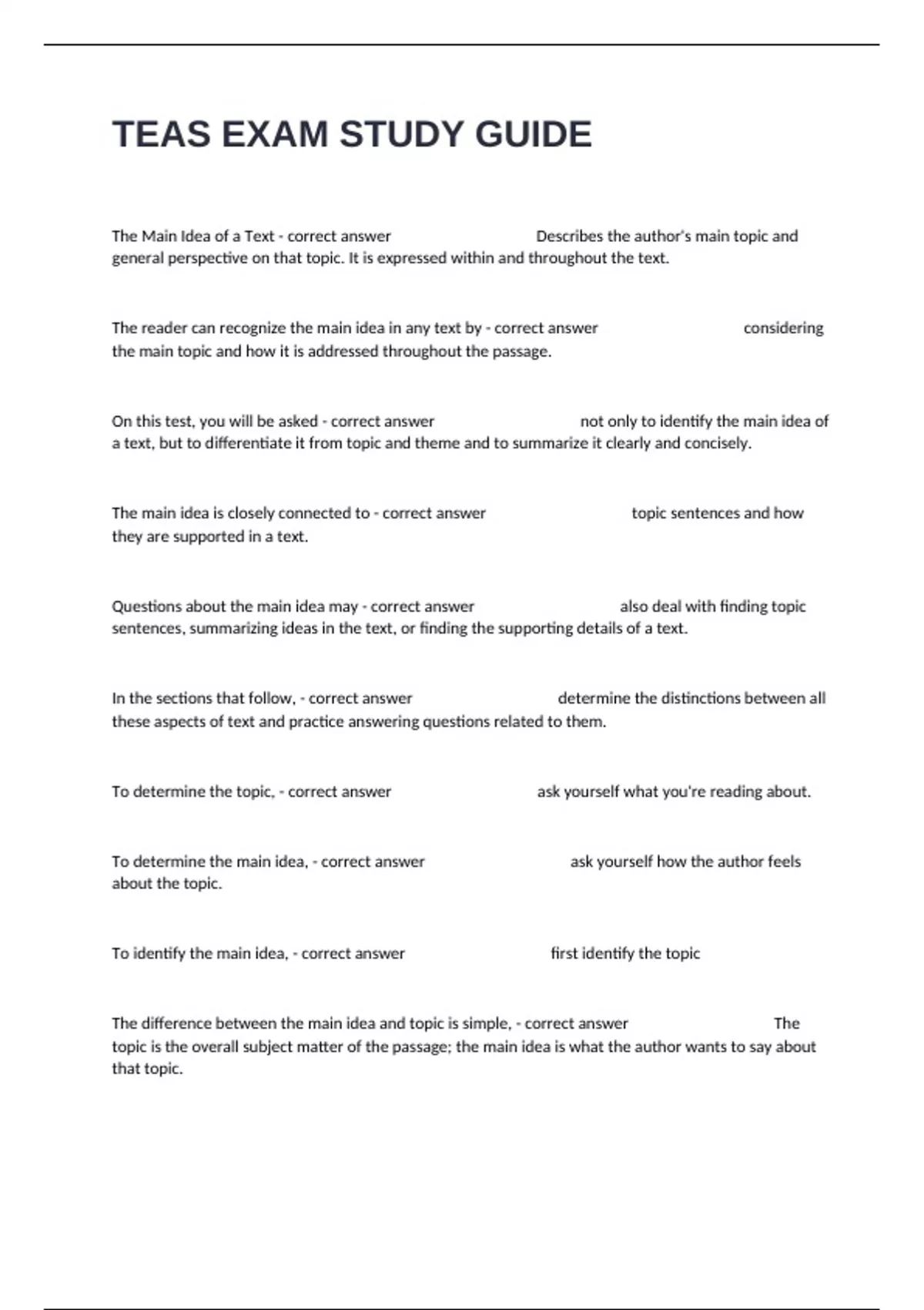 TEAS EXAM STUDY GUIDE WITH COMPLETE QUESTIONS AND WELL DEFINED ANSWERS.
