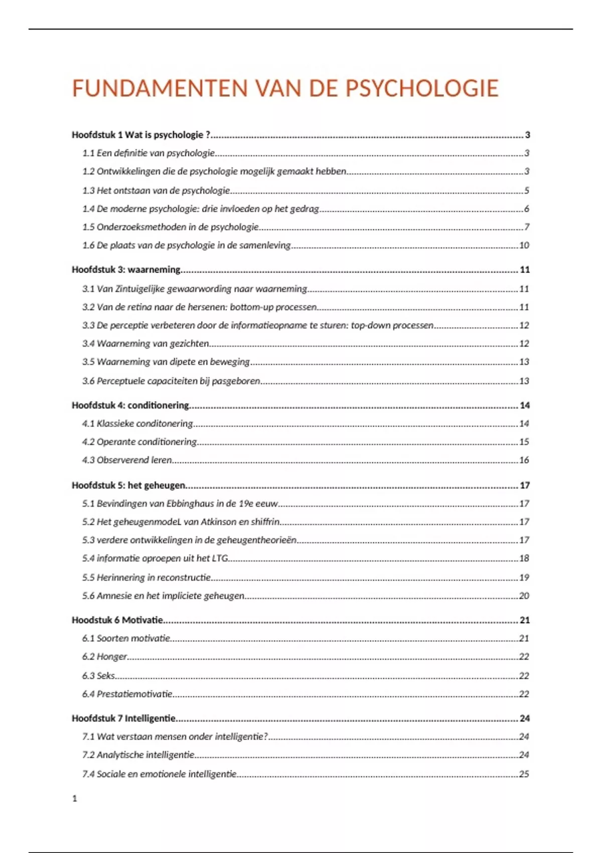 Het document bevat een volledige samenvatting met de hoofdstukken die relevant zijn voor het tentamen van het vak fundamenten van de psychologie. Dit vak wordt gegeven gedurende de minor inleiding tot de toegepaste psychologie op de Hogeschool van Utrecht. Het is een samenvatting van het boek uit het jaar 2021!