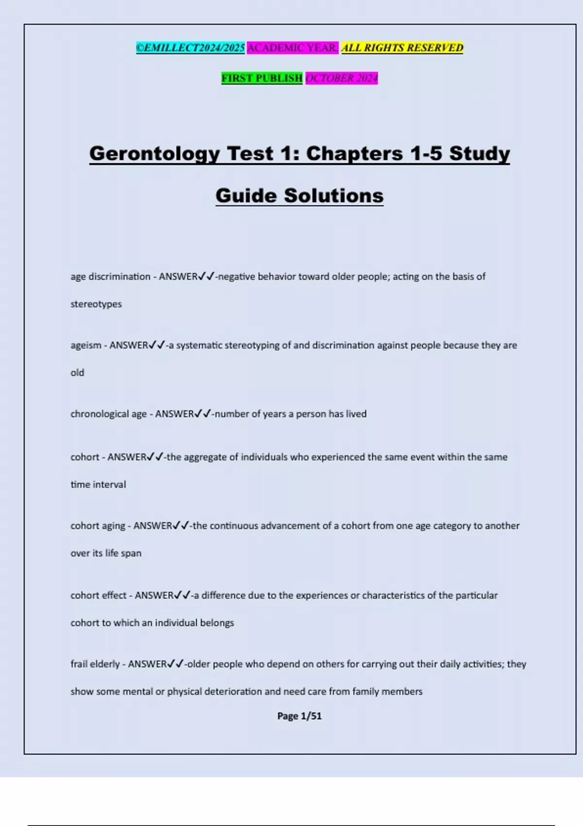 gerontology - ANSWER✔✔-the scientific study of the biological, psychological, and social aspects of