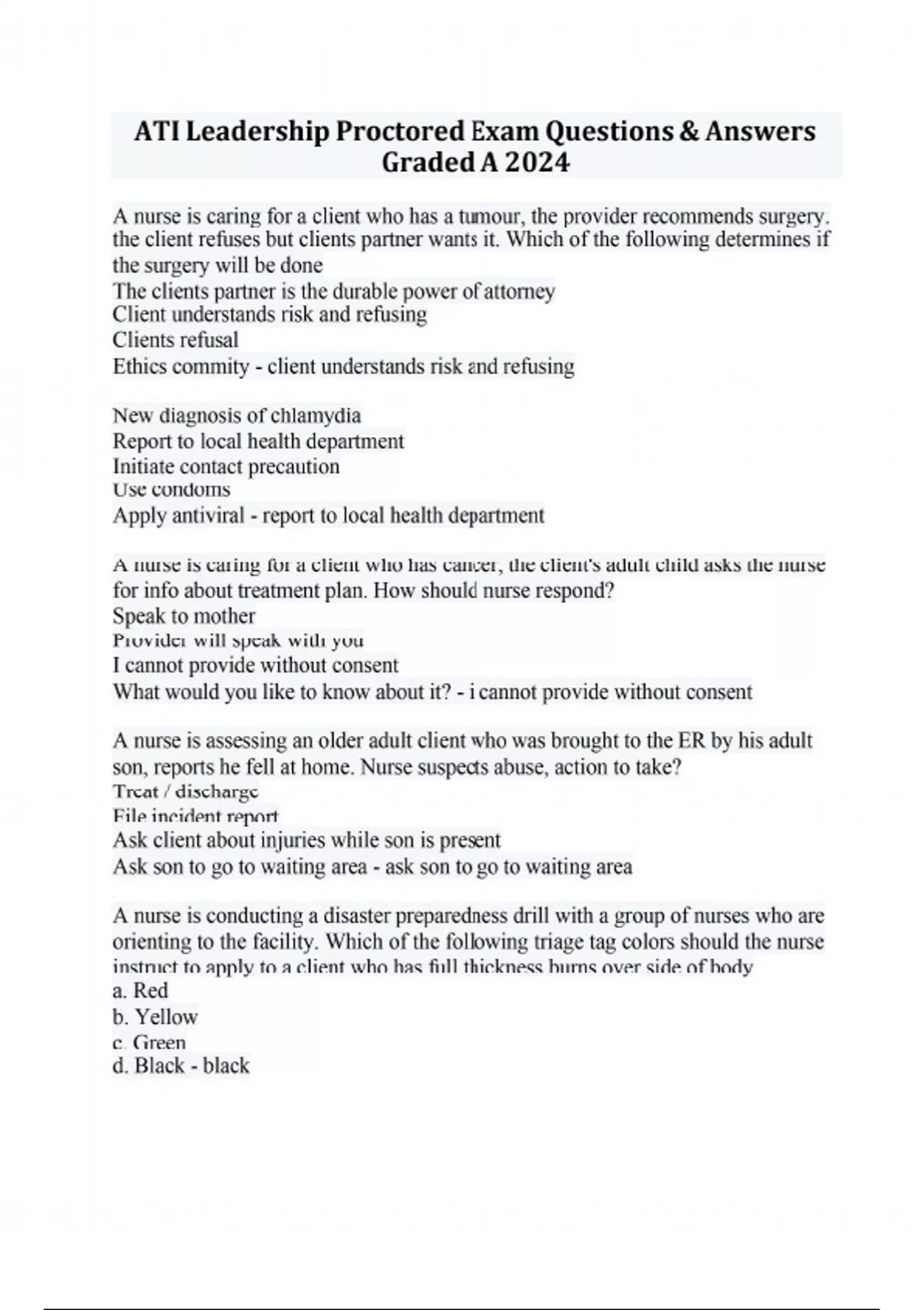 A nurse is caring for a client who has a tumour, the provider recommends surgery. the client refuses but clients partner wants it. Which of the following determines if the surgery will be done The clients partner is the durable power of attorney Client understands risk and refusing Clients refusal Ethics commity - client understands risk and refusing New diagnosis of chlamydia Report to local health department Initiate contact precaution Use condoms Apply antiviral - report to local health department A nurse is caring for a client who has cancer, the client's adult child asks the nurse for info about treatment plan. How should nurse respond? Speak to mother Provider will speak with you I cannot provide without consent What would you like to know about it? - i cannot provide without consent A nurse is assessing an older adult client who was brought to the ER by his adult son, reports he fell at home. Nurse suspects abuse, action to take? Treat / discharge File incident report Ask client about injuries while son is present Ask son to go to waiting area - ask son to go to waiting area A nurse is conducting a disaster preparedness drill with a group of nurses who are orienting to the facility. Which of the following triage tag colors should the nurse instruct to apply to a client who has full thickness burns over side of body a. Red b. Yellow c. Green d. Black - black ATI Leadership Proctored Exam Questions & Answers Graded A 2024 A nurse on a med surg unit is caring for a client who asks about advance directives and wants to appoint a health care proxy. Which of the following responses should the nurse make? Choose a family member Attorney Decisions when you are unable to do so Appoint before undergoing procedure - decisions when you are unable to do so A hospice nurse is caring for a client who has a terminal illness. Reports severe pain, prescribed meds, difficult to arouse. Nurse should a. Continue opioid Contact provider Administer benzo Without opioid Continue the medication dosages - continue the medication dosages A nurse is orienting a newly licensed nurse about confidentiality. Which indicates an understanding? Use another's password as long as I log off after Discard personal info in trash before leaving Post clients signs in room Encrypt when sending emails - encrypt when sending emails A nurse is delegating care for a group of clients. Which of the following should be assigned to an LVN? Scheduled endoscopy, enema DM requires teaching Client who has MI, transferring to unit from CCU New client with sickle cell - scheduled enema A nurse on a med surg unit is caring for 4 clients. Highest priority? MRSA Absent pedal pulse in the right foot Post op, able to void Pancreatic cancer new dx - absent pedal pulse in the right foot manager, cna incorrectly transferring to bedside commode, actions for nurse refer to procedure manual Help AP assist client with transfer instruct to request assist when unsure with a task - help ap assist client with transfer Nurse in ER admits clients exposed to anthrax a. Prepare to administer abx to client b. Antiviral - prepare to administer antibiotics to client A nurse is caring for a client who is unconscious, partner is health care surrogate, partner wants to dc feeding tube, another family wants to continue tx Contact provider Speak with ethics committee Nursing supervisor - speak with ethiccs committee a nurse is preparing to discontinue client with end stage heart failure, partner can no longer care a. ask another family member to assist ask provider to delay dc contact case manager recommend long term facility - contact case manager A nurse is providing COS report for oncoming nurse. Nurse should include Local banks Vital signs as prescribed Radiology for xray Clients partner came 2 hours ago - Clients partner came 2 hours ago A nurse in er is preparing for client who arrived via ambulance, disoriented, cardiac arrythmia, action for nurse High risk manager Clients next of kin Client sign Proceed with procedure without consent - proceed with procedure with consent A nurse is preparing to dc client who requires home oxygen, company has not delivered tank Notify provider about delay Contact social services Instruct family to contact insurance provider Send one home from facility - contact social services A nurse from med surg caring for group of clients, delegate to LPN? Urine specimen from older adult client Wound debridement to PT Postmortem care Reinforce dietary teaching for heart disease - urine specimen from older adult client