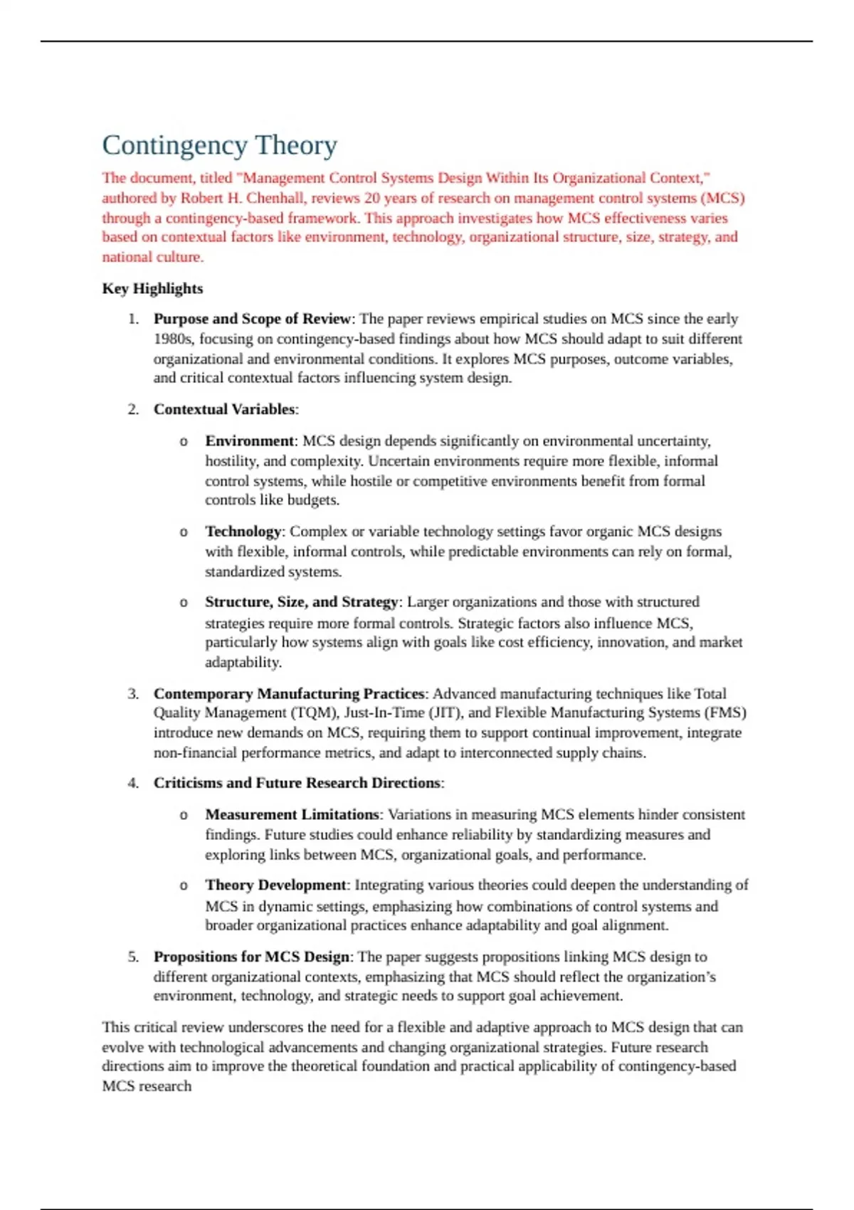 o Environment: MCS design depends significantly on environmental uncertainty,