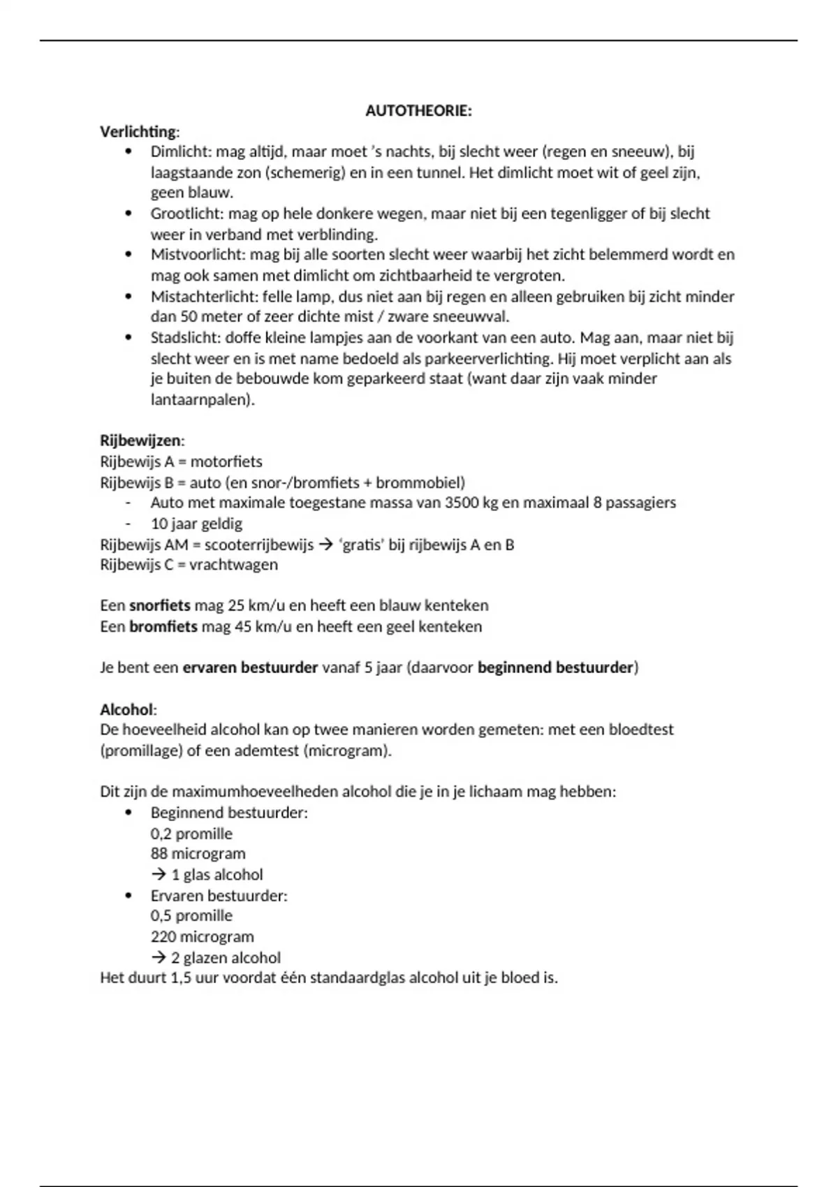 Een volledige samenvatting van alle stof die nodig is voor het theorie examen van het CBR voor het autorijbewijs.