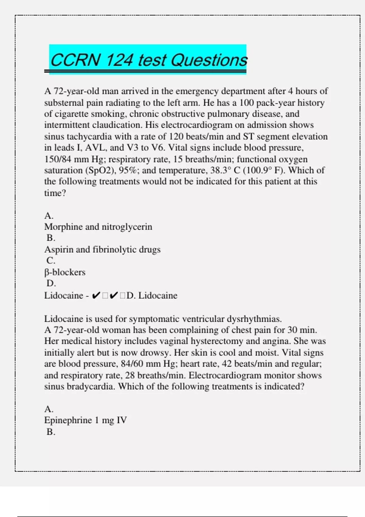 A 72-year-old man arrived in the emergency department after 4 hours of substernal pain radiating to the left arm. He has a 100 pack-year history of cigarette smoking, chronic obstructive pulmonary disease, and intermittent claudication. His electrocardiogram on admission shows sinus tachycardia with a rate of 120 beats/min and ST segment elevation in leads I, AVL, and V3 to V6. Vital signs include blood pressure, 150/84 mm Hg; respiratory rate, 15 breaths/min; functional oxygen saturation (SpO2), 95%; and temperature, 38.3° C (100.9° F). Which of the following treatments would not be indicated for this patient at this time? A. Morphine and nitroglycerin B. Aspirin and fibrinolytic drugs C. β-blockers D. Lidocaine - ️️D. Lidocaine Lidocaine is used for symptomatic ventricular dysrhythmias. A 72-year-old woman has been complaining of chest pain for 30 min. Her medical history includes vaginal hysterectomy and angina. She was initially alert but is now drowsy. Her skin is cool and moist. Vital signs are blood pressure, 84/60 mm Hg; heart rate, 42 beats/min and regular; and respiratory rate, 28 breaths/min. Electrocardiogram monitor shows sinus bradycardia. Which of the following treatments is indicated? A. Epinephrine 1 mg IV B. Atropine 0.5 mg IV C. Isoproterenol IV infusion at 2 mcg/min D. Transcutaneous pacemaker - ️️D. Transcutaneous pacemaker