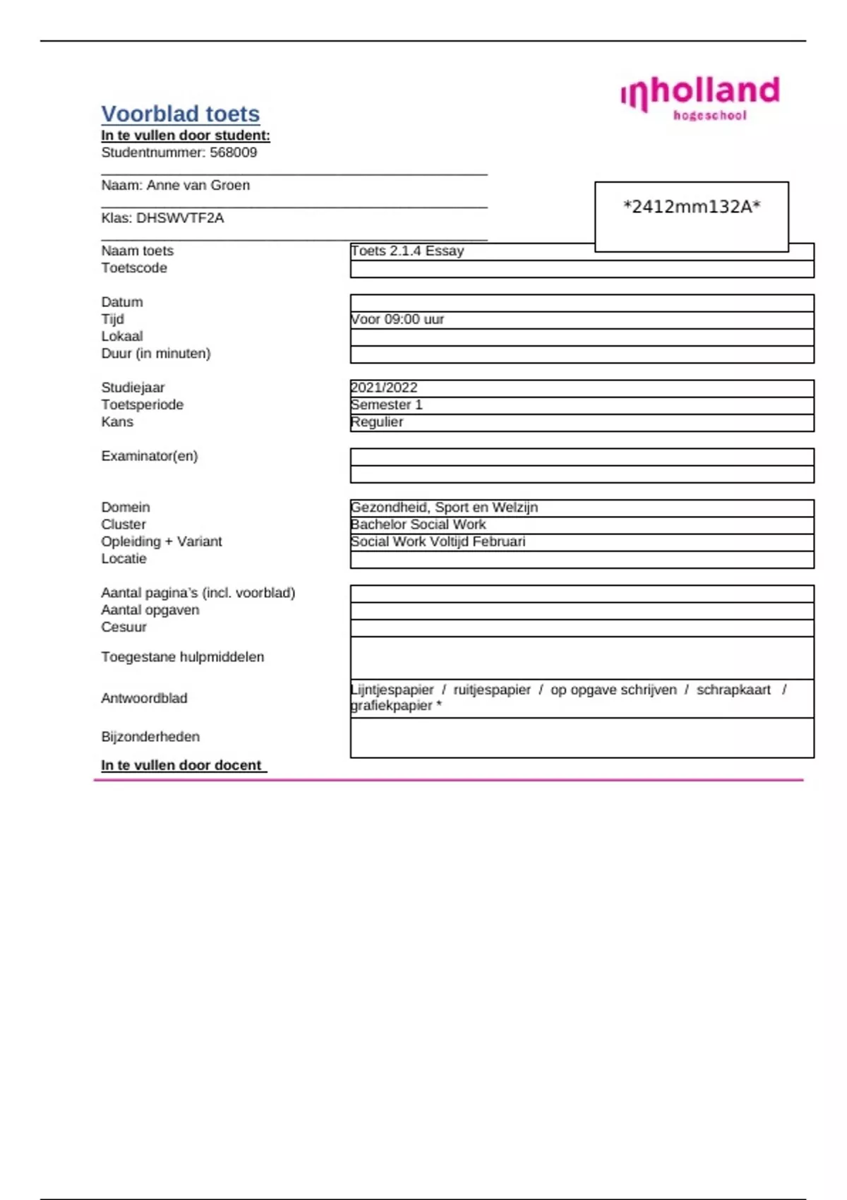 Voorblad toets