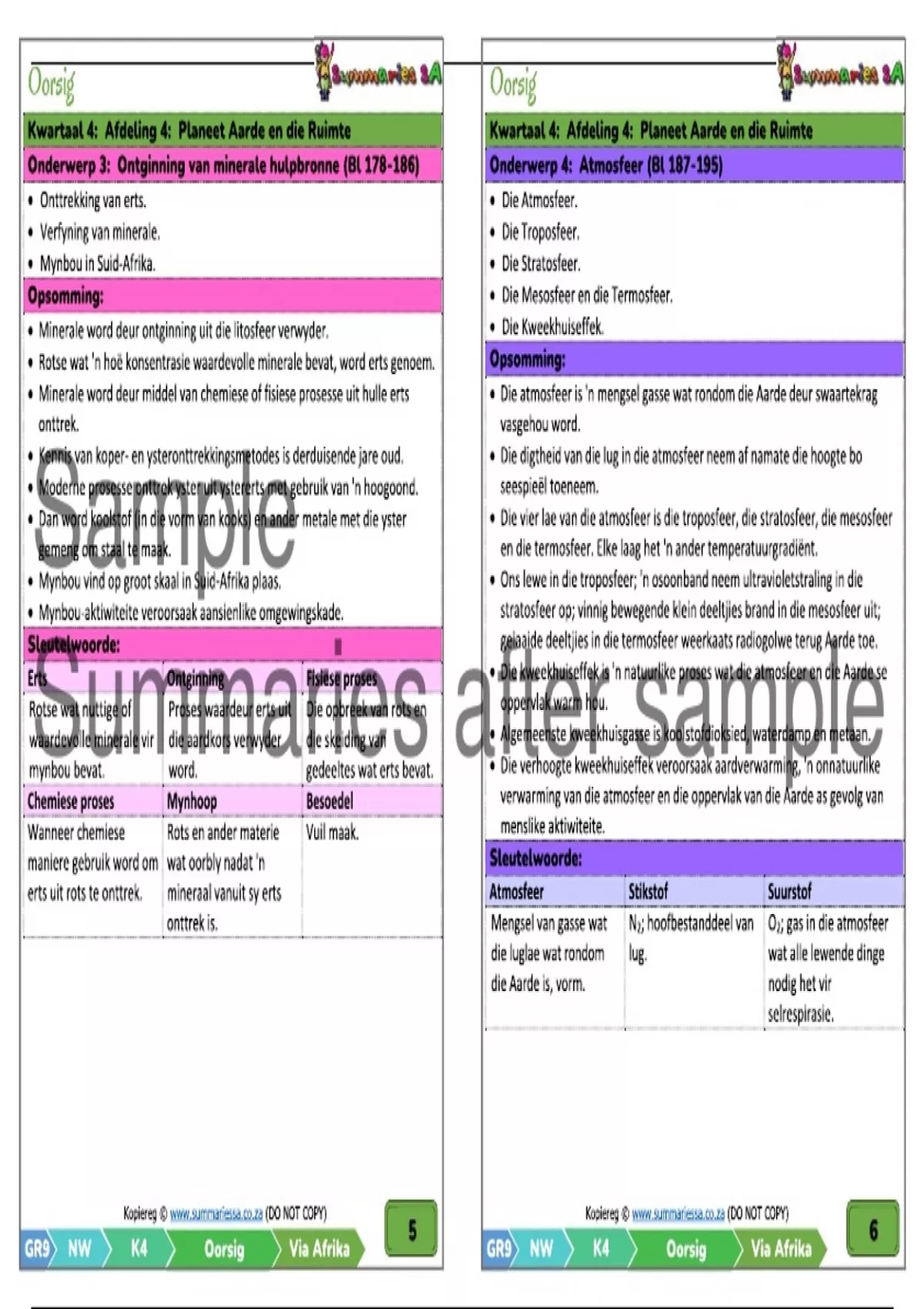 Graad 9 Natuurwetenskappe (NW) Opsommings Kwartaal 4: Die opsommings is saamgestel deur die Via Afrika handboek se werk op te som. Opsommings is in Afrikaans met aanvullende en skriftelike notas wat deur die opsteller saam gestel is. Afdeling 4 - Planeet Aarde en die Ruimte. Onderwerp 1: Die Aarde as ‘n stelsel. Onderwerp 2: Litosfeer. Onderwerp 3: Ontginning van minerale hulpbronne. Onderwerp 4: Atmosfeer. Onderwerp 5: Geboorte, lewe en afsterwe van sterre.