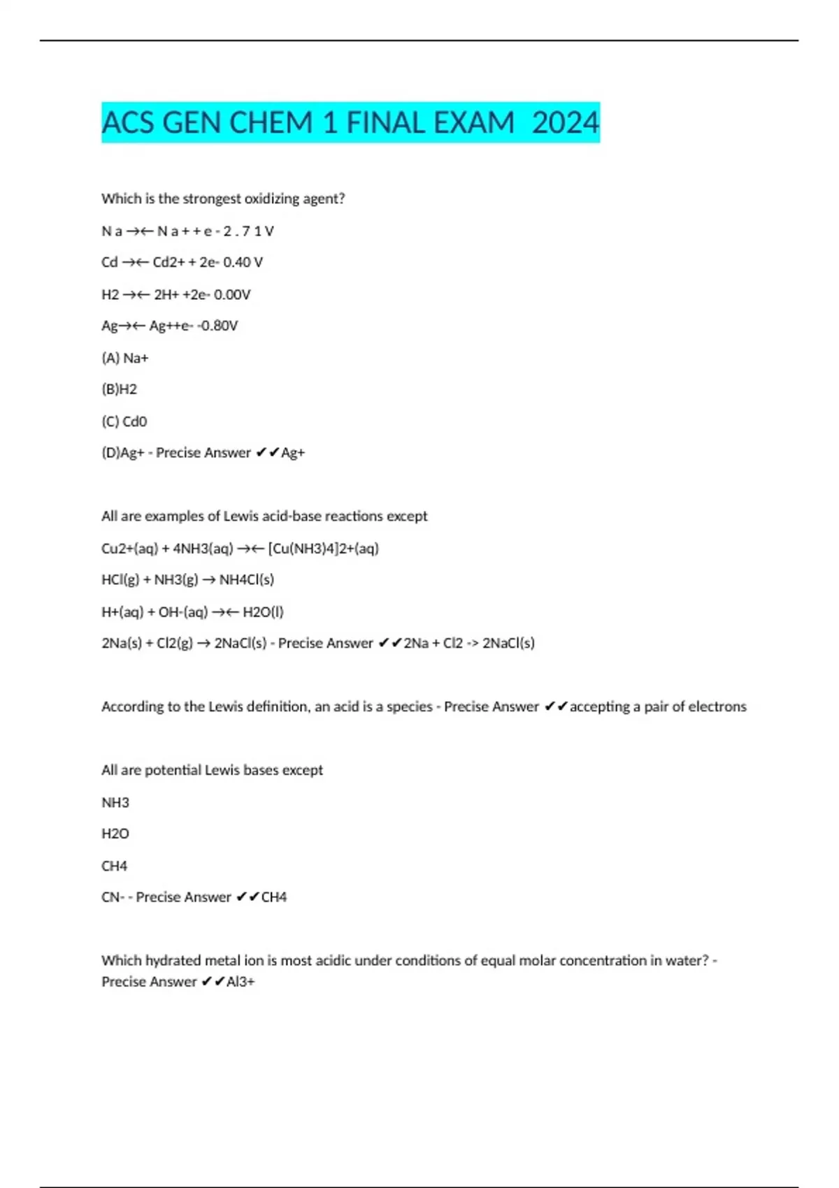 ACS GEN CHEM 1 FINAL EXAM 2024