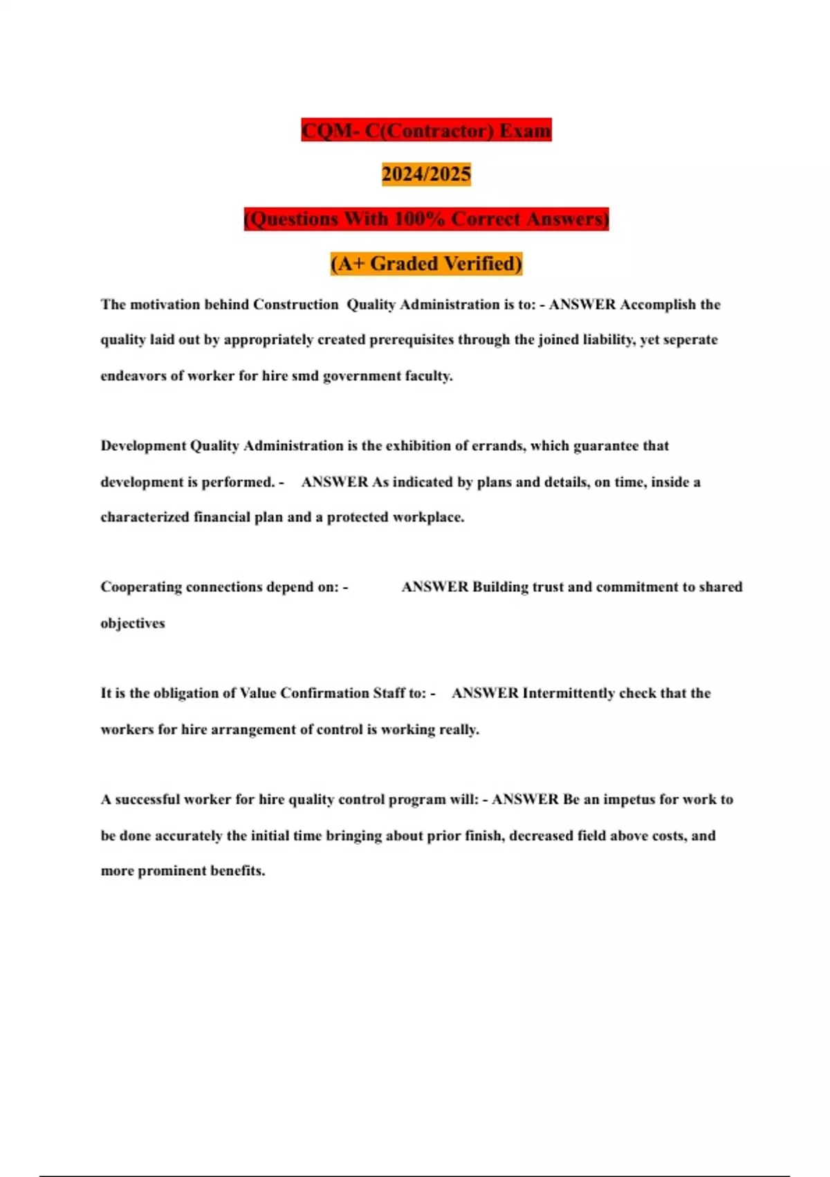 CQM- C(Contractor) Exam 2024/2025 (Questions With 100% Correct Answers) (A+ Graded Verified)