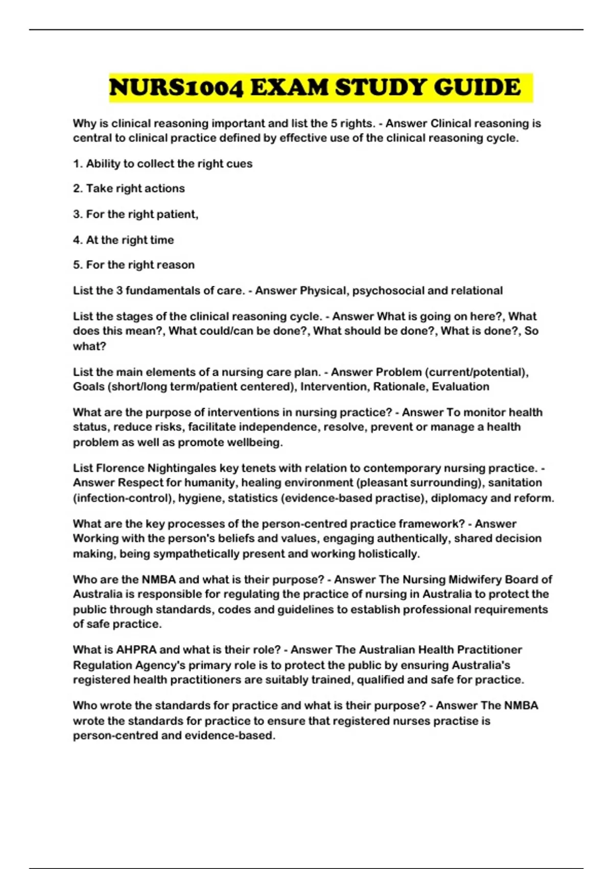 NURS1004 EXAM STUDY GUIDE