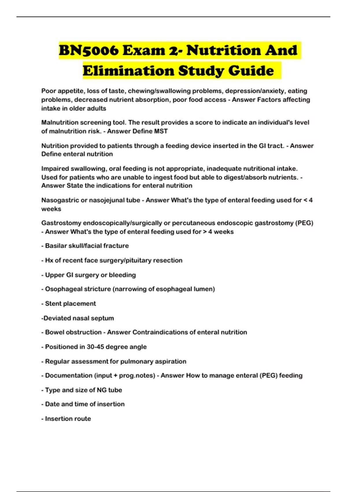 - Bowel obstruction - Answer Contraindications of enteral nutrition