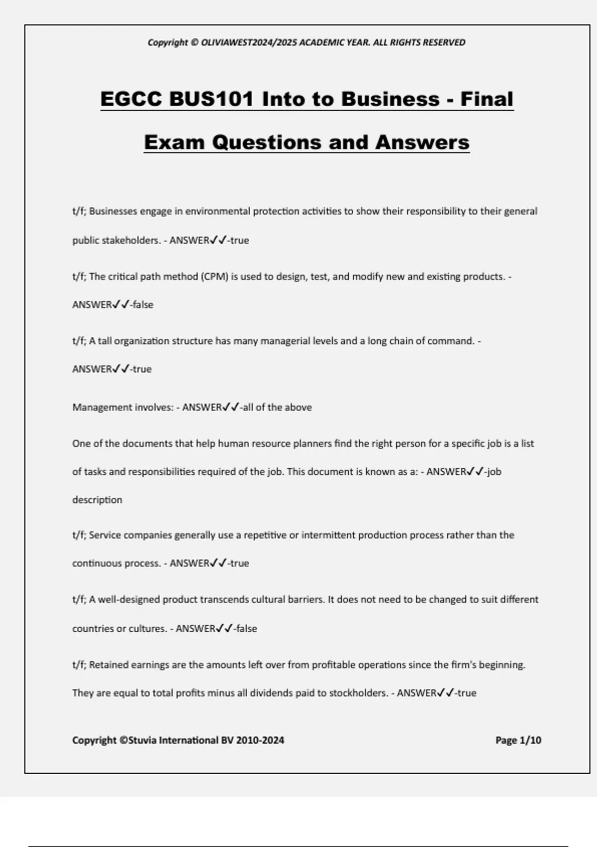 EGCC BUS101 Into to Business - Final Exam Questions and Answers t/f; Businesses engage in environmental protection activities to show their responsibility to their general public stakeholders. - ANSWER-true t/f; The critical path method (CPM) is used to design, test, and modify new and existing products. - ANSWER-false t/f; A tall organization structure has many managerial levels and a long chain of command. - ANSWER-true Management involves: - ANSWER-all of the above One of the documents that help human resource planners find the right person for a specific job is a list of tasks and responsibilities required of the job. This document is known as a: - ANSWER-job description t/f; Service companies generally use a repetitive or intermittent production process rather than the continuous process. - ANSWER-true t/f; A well-designed product transcends cultural barriers. It does not need to be changed to suit different countries or cultures. - ANSWER-false t/f; Retained earnings are the amounts left over from profitable operations since the firm's beginning. They are equal to total profits minus all dividends paid to stockholders. - ANSWER-true Copyright © OLIVIAWEST2024/2025 ACADEMIC YEAR. ALL RIGHTS RESERVED Copyright ©Stuvia International BV Page 2/10 t/f; Economics is the study of a society's financial institutions. - ANSWER-false The marketing concept: -satisfies customer wants and needs legally and responsibly -does all of the above - focuses on customer wants so the company can differentiate its product from its competition -integrates all of the company's activities to satisfy customer wants - achieves long-term organizational goals - ANSWER-does all of the above t/f; A current asset is one that can or will be converted into cash within one year. - ANSWER-true _____ is the set of moral standards for judging whether something is right or wrong. - ANSWER- ethics _____ is the gap between what is and what is desired, and _____ is the gap between what is and what is required. - ANSWER-a want; a need t/f; Employee ownership creates too much stress and is a poor motivator. - ANSWER-false t/f; Types of promotional goals include creating awareness, increasing the use of products, and identifying potential customers. - ANSWER-true t/f; Internet retailing is also called e-retailing. - ANSWER-true t/f; The International Monetary Fund (IMF) was created to promote trade through financial cooperation by working to eliminate trade barriers. - ANSWER-tru