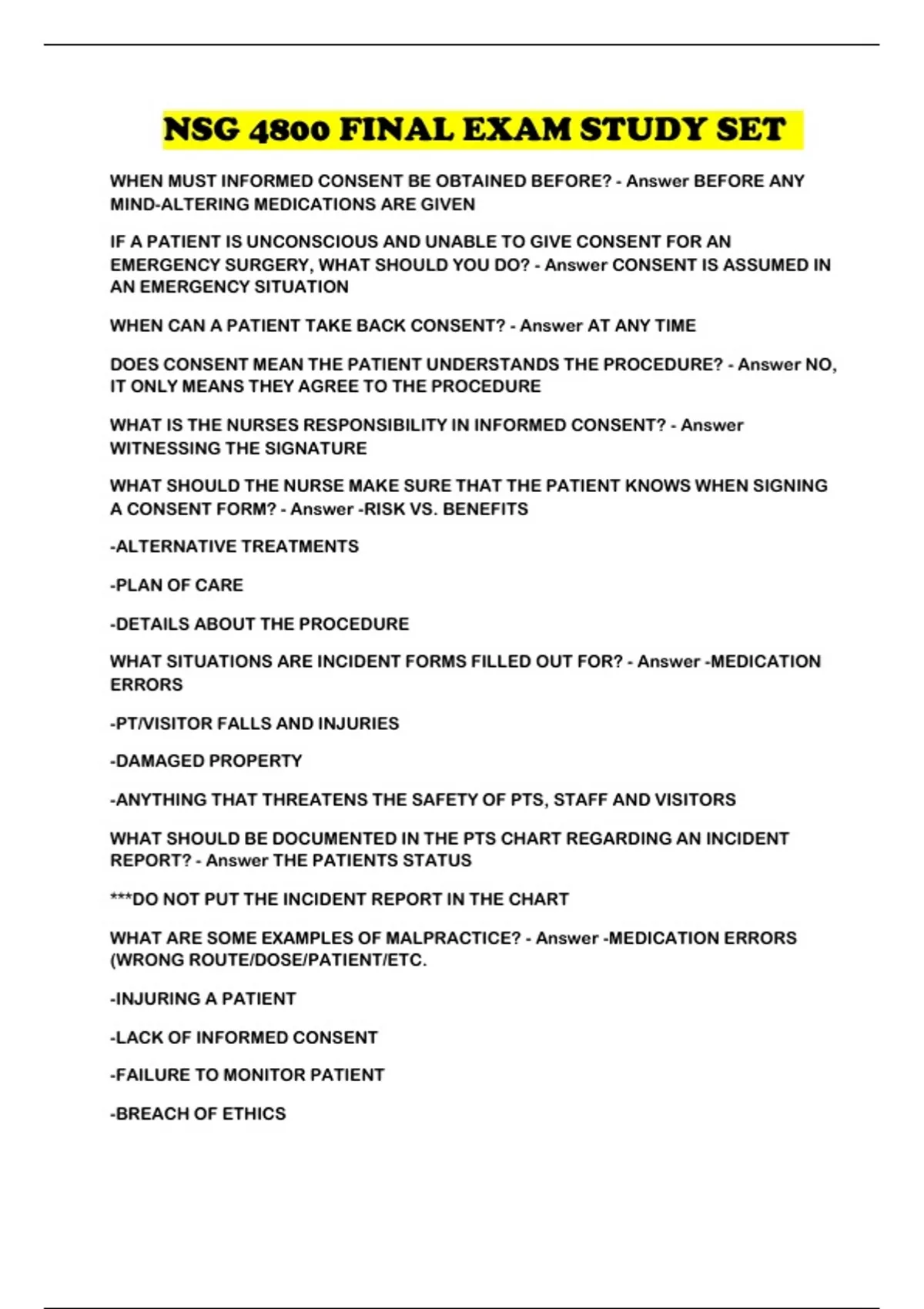 NSG 4800 FINAL EXAM STUDY SET