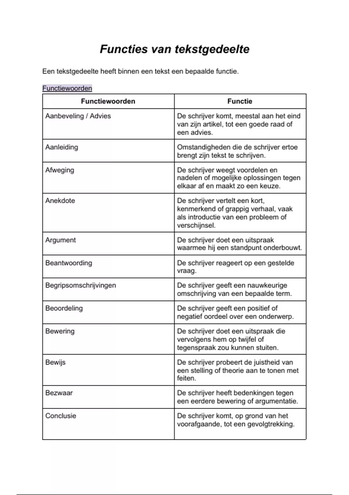Een tekstgedeelte heeft binnen een tekst een bepaalde functie.