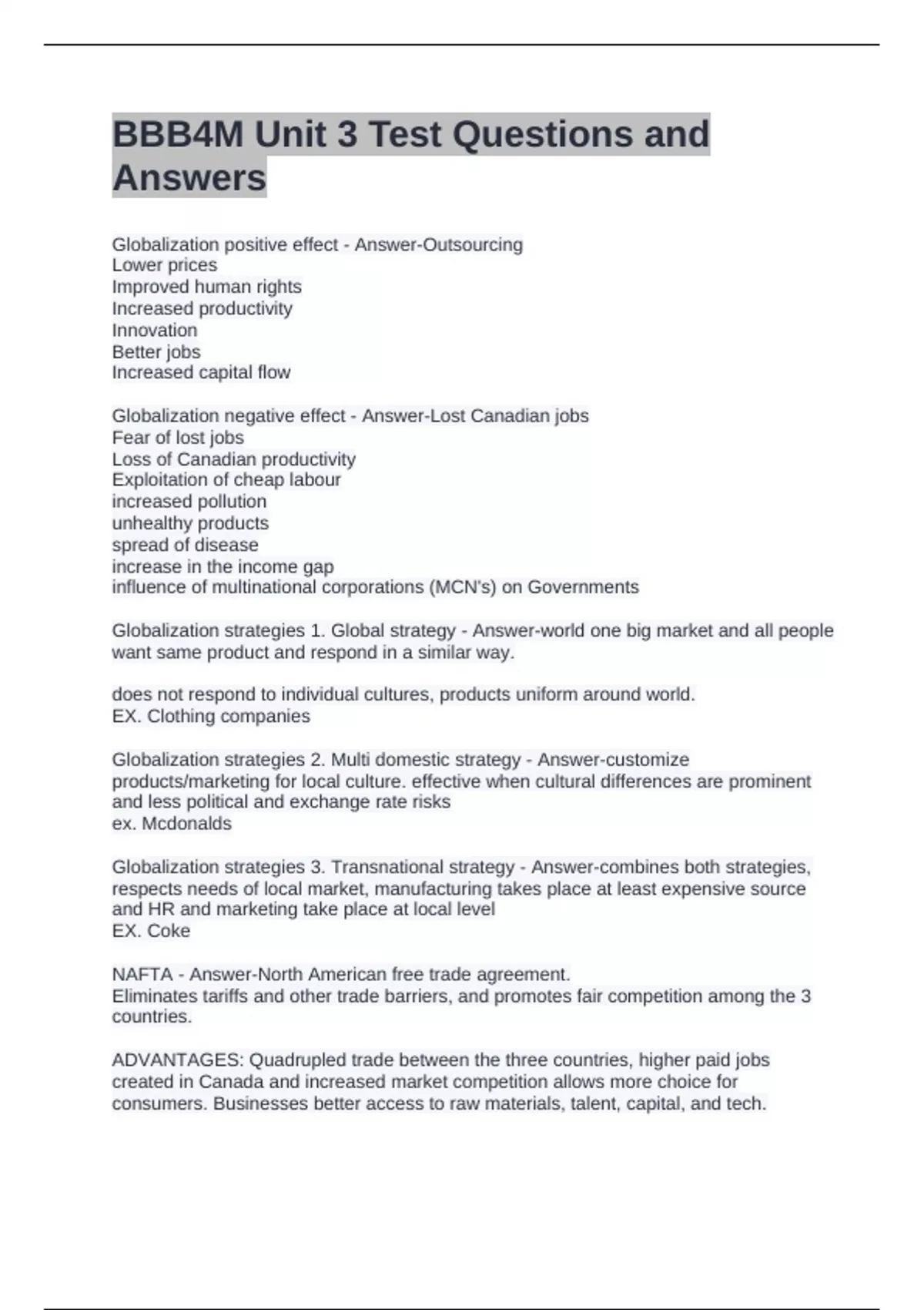Globalization strategies 1. Global strategy - Answer-world one big market and all people