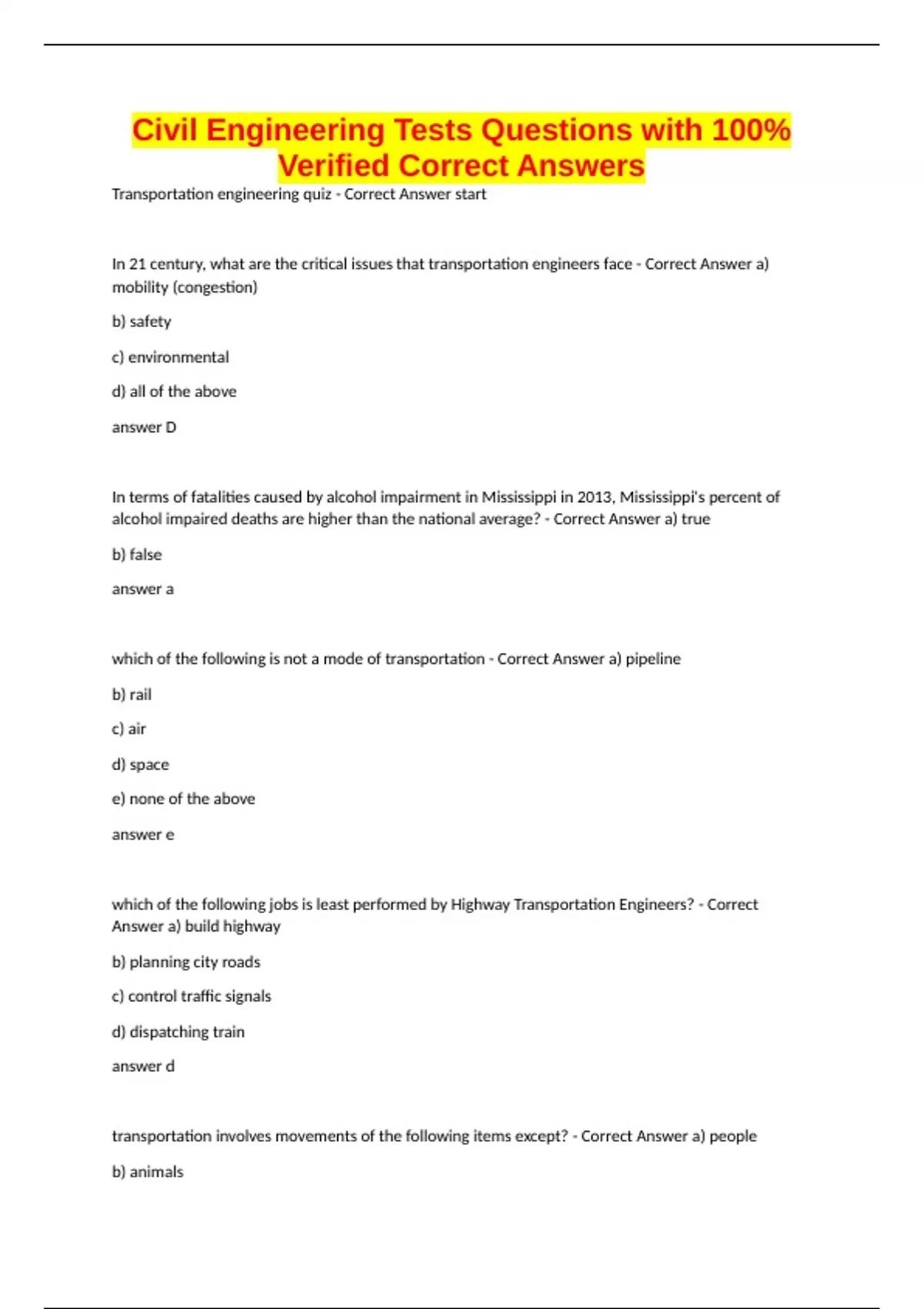 Civil Engineering Tests Questions with 100% Verified Correct Answers Transportation engineering quiz - Correct Answer start In 21 century, what are the critical issues that transportation engineers face - Correct Answer a) mobility (congestion) b) safety c) environmental d) all of the above answer D In terms of fatalities caused by alcohol impairment in Mississippi in 2013, Mississippi's percent of alcohol impaired deaths are higher than the national average? - Correct Answer a) true b) false answer a which of the following is not a mode of transportation - Correct Answer a) pipeline b) rail c) air d) space e) none of the above answer e which of the following jobs is least performed by Highway Transportation Engineers? - Correct Answer a) build highway b) planning city roads c) control traffic signals d) dispatching train answer d transportation involves movements of the following items except? - Correct Answer a) people b) animals c) information
