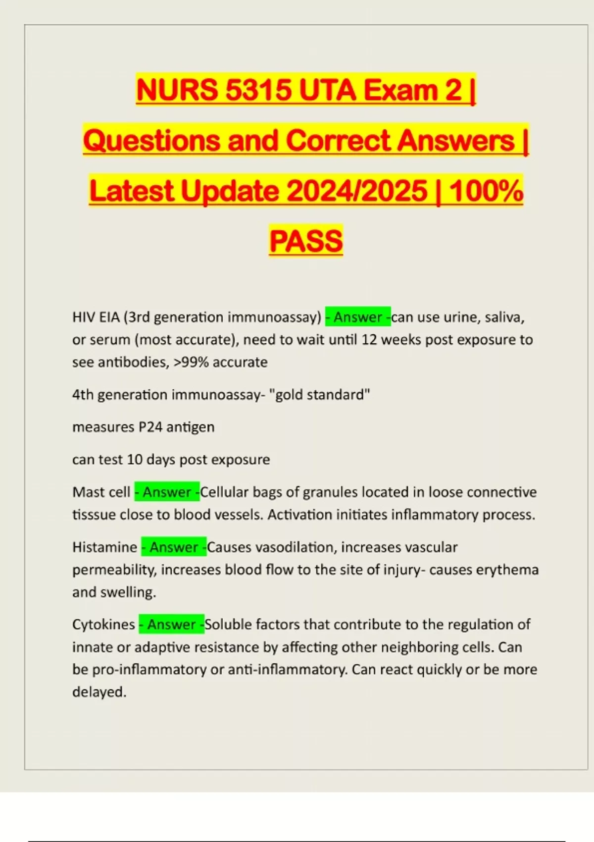NURS 5315 UTA Exam 2 | Questions and Correct Answers | Latest Update 2024/2025 | 100% PASS HIV EIA (3rd generation immunoassay) - Answer -can use urine, saliva, or serum (most accurate), need to wait until 12 weeks post exposure to see antibodies, >99% accurate 4th generation immunoassay- "gold standard" measures P24 antigen can test 10 days post exposure Mast cell - Answer -Cellular bags of granules located in loose connective tisssue close to blood vessels. Activation initiates inflammatory process. Histamine - Answer -Causes vasodilation, increases vascular permeability, increases blood flow to the site of injury- causes erythema and swelling. Cytokines - Answer -Soluble factors that contribute to the regulation of innate or adaptive resistance by affecting other neighboring cells. Can be pro-inflammatory or anti-inflammatory. Can react quickly or be more delayed.Leukotrines - Answer -Released when mast