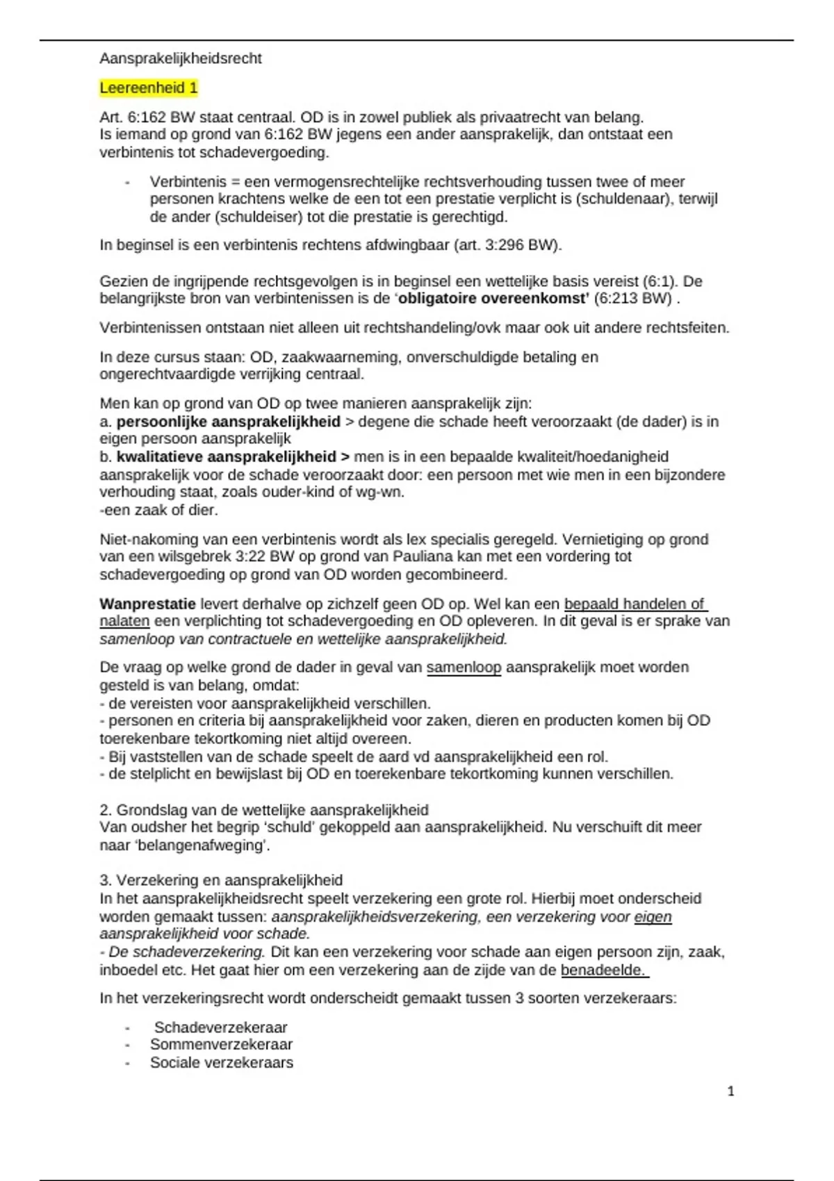 - personen en criteria bij aansprakelijkheid voor zaken, dieren en producten komen bij OD