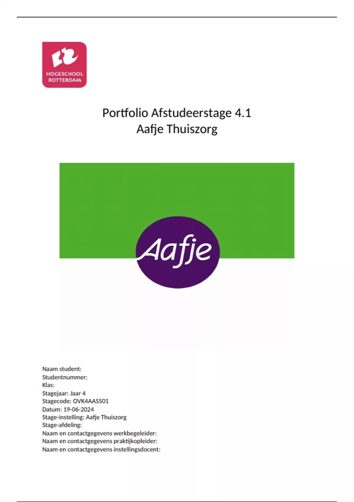 Dit is mijn portfolio voor mijn afstudeerstage in de thuiszorg. Ik heb 2 hele duidelijke KBS'en geschreven en al mijn bewijslast zit er ook bij. Ik heb voor mijn portfolio een 8 behaald!