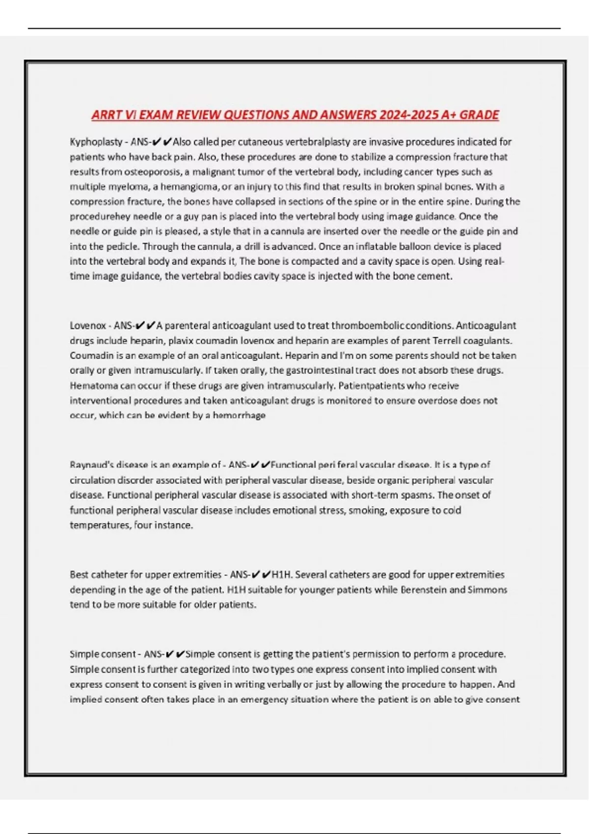 ARRT VI EXAM REVIEW QUESTIONS AND ANSWERS A+ GRADE Kyphoplasty - ANS-Also called per cutaneous vertebralplasty are invasive procedures indicated for patients who have back pain. Also, these procedures are done to stabilize a compression fracture that results from osteoporosis, a malignant tumor of the vertebral body, including cancer types such as multiple myeloma, a hemangioma, or an injury to this find that results in broken spinal bones. With a compression fracture, the bones have collapsed in sections of the spine or in the entire spine. During the procedurehey needle or a guy pan is placed into the vertebral body using image guidance. Once the needle or guide pin is pleased, a style that in a cannula are inserted over the needle or the guide pin and into the pedicle. Through the cannula, a drill is advanced. Once an inflatable balloon device is placed into the vertebral body and expands it, The bone is compacted and a cavity space is open. Using realtime image guidance, the vertebral bodies cavity space is injected with the bone cement. Lovenox - ANS-A parenteral anticoagulant used to treat thromboembolic conditions. Anticoagulant drugs include heparin, plavix coumadin lovenox and heparin are examples of parent Terrell coagulants. Coumadin is an example of an oral anticoagulant. Heparin and I'm on some parents should not be taken orally or given intramuscularly. If taken orally, the gastrointestinal tract does not absorb these drugs. Hematoma can occur if these drugs are given intramuscularly. Patientpatients who receive interventional procedures and taken anticoagulant drugs is monitored to ensure overdose does not occur, which can be evident by a hemorrhage Raynaud's disease is an example of - ANS-Functional peri feral vascular disease. It is a type of circulation disorder associated with peripheral vascular disease, beside organic peripheral vascular disease. Functional peripheral vascular disease is associated with short-term spasms. The onset of functional peripheral vascular disease includes emotional stress, smoking, exposure to cold temperatures, four instance. Best catheter for upper extremities - ANS-H1H. Several catheters are good for upper extremities depending in the age of the patient. H1H suitable for younger patients while Berenstein and Simmons tend to be more suitable for older patients. Simple consent - ANS-Simple consent is getting the patient's permission to perform a procedure. Simple consent is further categorized into two types one express consent into implied consent with express consent to consent is given in writing verbally or just by allowing the procedure to happen. And implied consent often takes place in an emergency situation where the patient is on able to give consent Uretic compression - ANS-A process that allows the pelvicalyceal to fill and for the contrast media to stay in the renal collecting system longer one more involved and complicated studies are performed. He device is used to perform the ureteric compression and is put on the patient before the contrast material is injected Leading cause of aortic aneurysms - ANS-Atherosclerosis is the leading cause of aortic aneurysm him. This condition occurs when aweakness develops in the lumbar region and the aorta balloons out Qualifications for abdominal aortic aneurysm ultrasound screening - ANS-Family history abdominal aortic aneurysm or, a male who is aged 65 to 75 years old, a male who smokes cigarettes and has smoked a minimum of 100 cigarettes over the course of his life Wilkie's syndrome - ANS-Hey vascular compression disorder of the superior mesenteric artery or SMA that can be checked with the vascular interventional radiology The posterior branches of the renal arteries supply blood to which of the part of the kidney? - ANS- Upper pole and posterior portion Best common catheter used for visceral angiography are - ANS-Cobras and sidewinders Visceral angiography evaluates bloodflow in the liver, spleen, and bowel External renal stone removal procedures are generally used for stones larger then - ANS-2 cm or 8 inches The folds in the brain matter are known as - ANS-Gyrus. The brain matter is made up of folds and fishers the folds are known as gyrus A digital image acquisition mode where one image is produced a refers to? - ANS-Digital angiography. Image production for vascular image has three types of modes for digital image ....