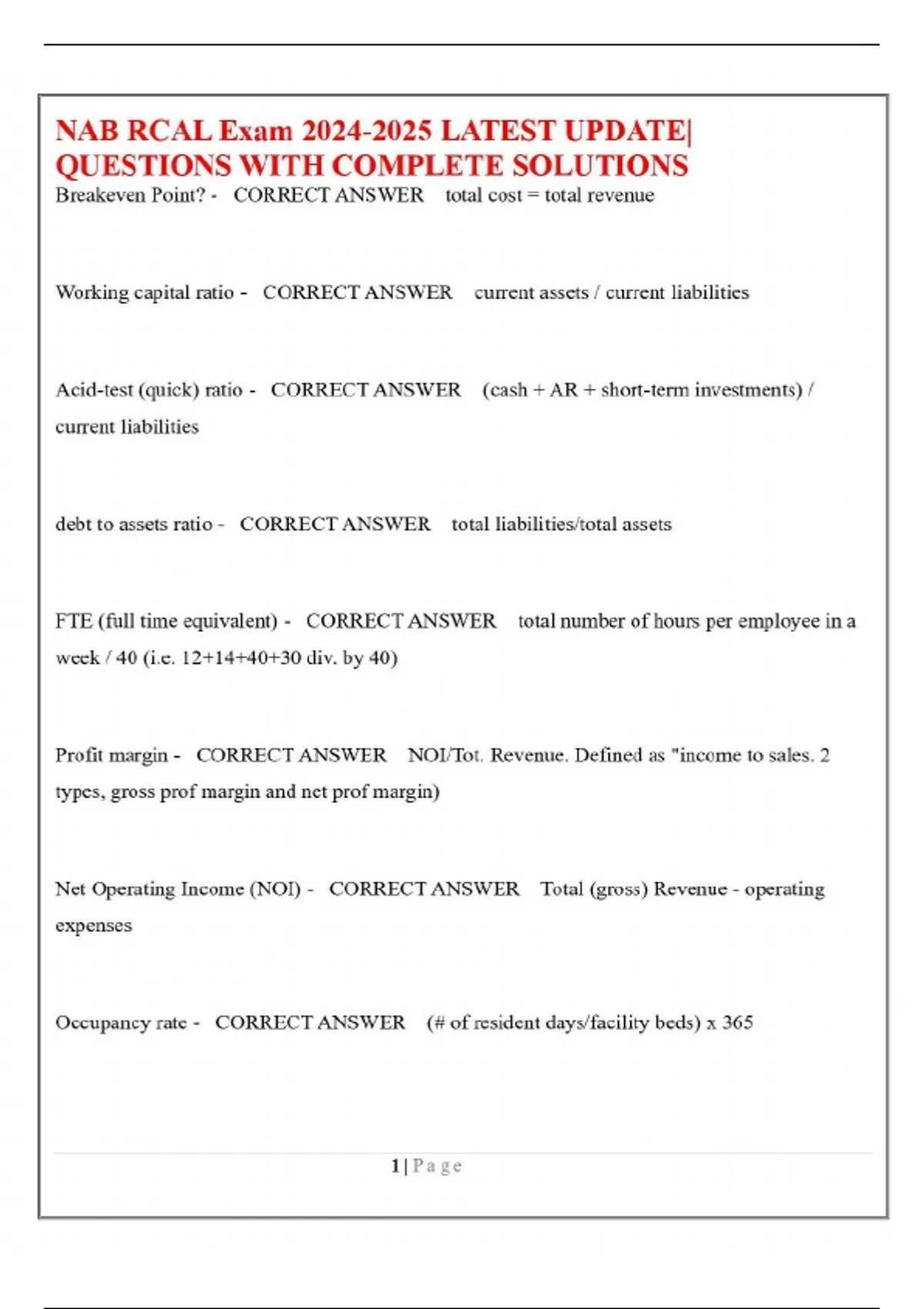 NAB RCAL Exam LATEST UPDATE| QUESTIONS WITH COMPLETE SOLUTIONS Breakeven Point? - CORRECT ANSWER total cost = total revenue Working capital ratio - CORRECT ANSWER current assets / current liabilities Acid-test (quick) ratio - CORRECT ANSWER (cash + AR + short-term investments) / current liabilities debt to assets ratio - CORRECT ANSWER total liabilities/total assets FTE (full time equivalent) - CORRECT ANSWER total number of hours per employee in a week / 40 (i.e. 12+14+40+30 div. by 40) Profit margin - CORRECT ANSWER NOI/Tot. Revenue. Defined as "income to sales. 2 types, gross prof margin and net prof margin) Net Operating Income (NOI) - CORRECT ANSWER Total (gross) Revenue - operating expenses Occupancy rate - CORRECT ANSWER (# of resident days/facility beds) x 365 NAB RCAL Exam LATEST UPDATE| QUESTIONS WITH COMPLETE SOLUTIONS 2 | P a g e HCS - CORRECT ANSWER Hazard Communication Standard. OSHA standard requiring employers to inform workers of potentially hazardous chemicals. Balance sheet formula - CORRECT ANSWER Assets = Liabilities + Shareholders Equity EBITDA - CORRECT ANSWER Earnings before interest, taxes, depreciation, and amortization Amortization - CORRECT ANSWER the reduction of a loan balance through payments made over a period of time revenue cycle management - CORRECT ANSWER resident needs->service planning- >staffing->billing/collections-> FICA SS Tax and Medicare Tax - CORRECT ANSWER 6.2% and 1.45% 4 elements of a valid contract - CORRECT ANSWER agreement, consideration, contractual capacity, legality (in writing) "ACCL" Liability insurance usually covers.. - CORRECT ANSWER Bodily injury and property damage