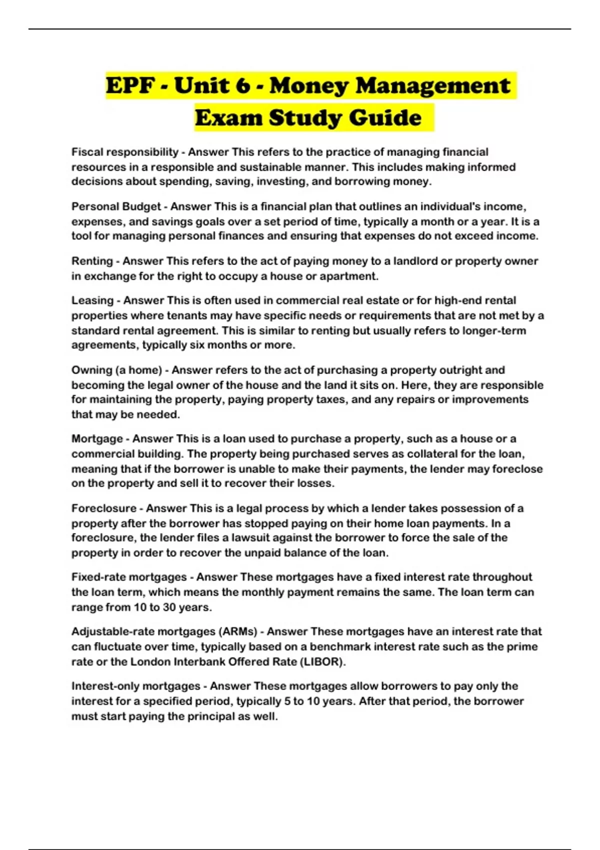EPF - Unit 6 - Money Management Exam Study Guide ...