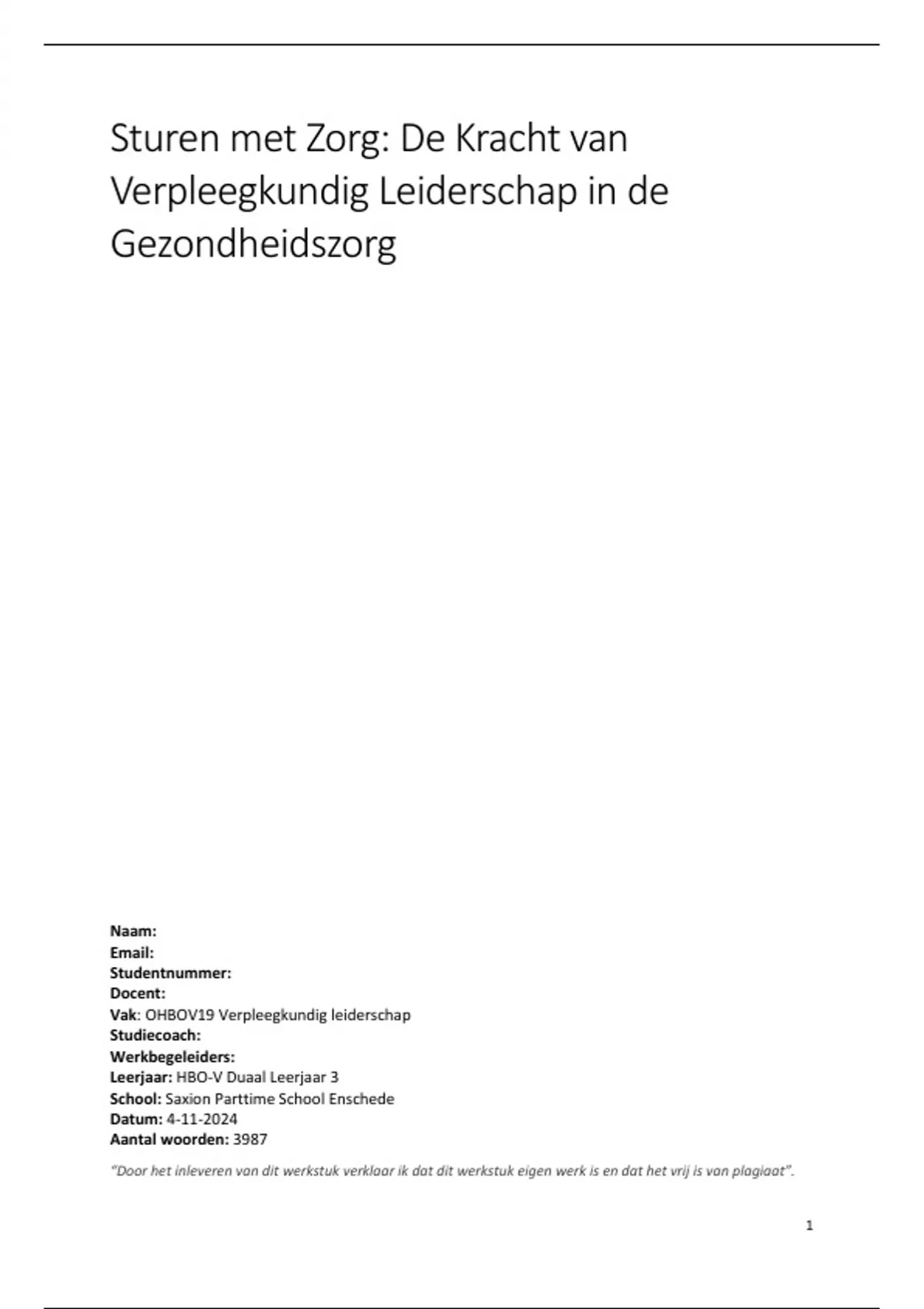 “Door het inleveren van dit werkstuk verklaar ik dat dit werkstuk eigen werk is en dat het vrij is van plagiaat”.