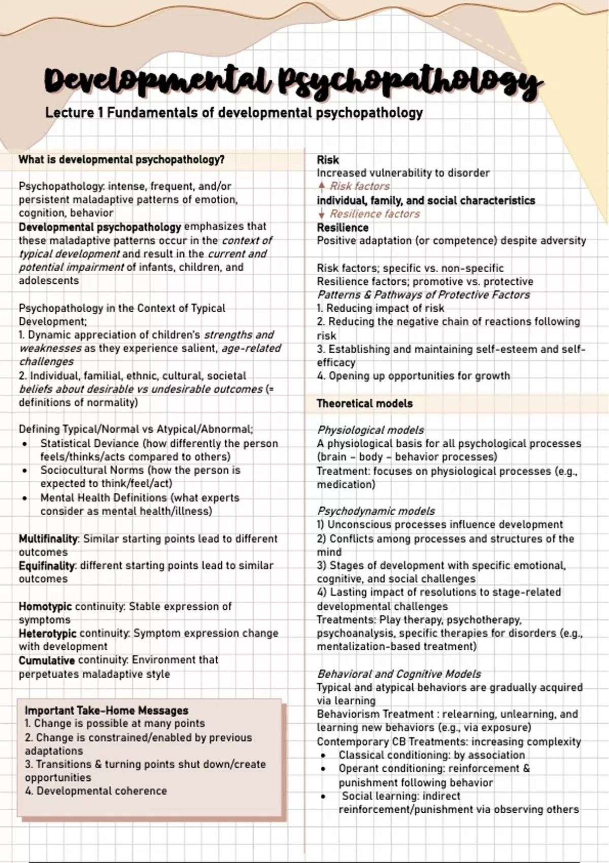 De samenvatting biedt een overzichtelijke weergave van de hoorcolleges van het vak Developmental Psychopathology, waarin verschillende thema's behandeld worden. Het document behandelt zowel theoretische modellen (zoals psychodynamische, cognitieve en gedragsmodellen) als praktische onderwerpen, waaronder ontwikkelingsstoornissen (ADHD, ASS), stemmingsstoornissen (angst, depressie), en specifieke leerstoornissen (dyslexie, dyscalculie).