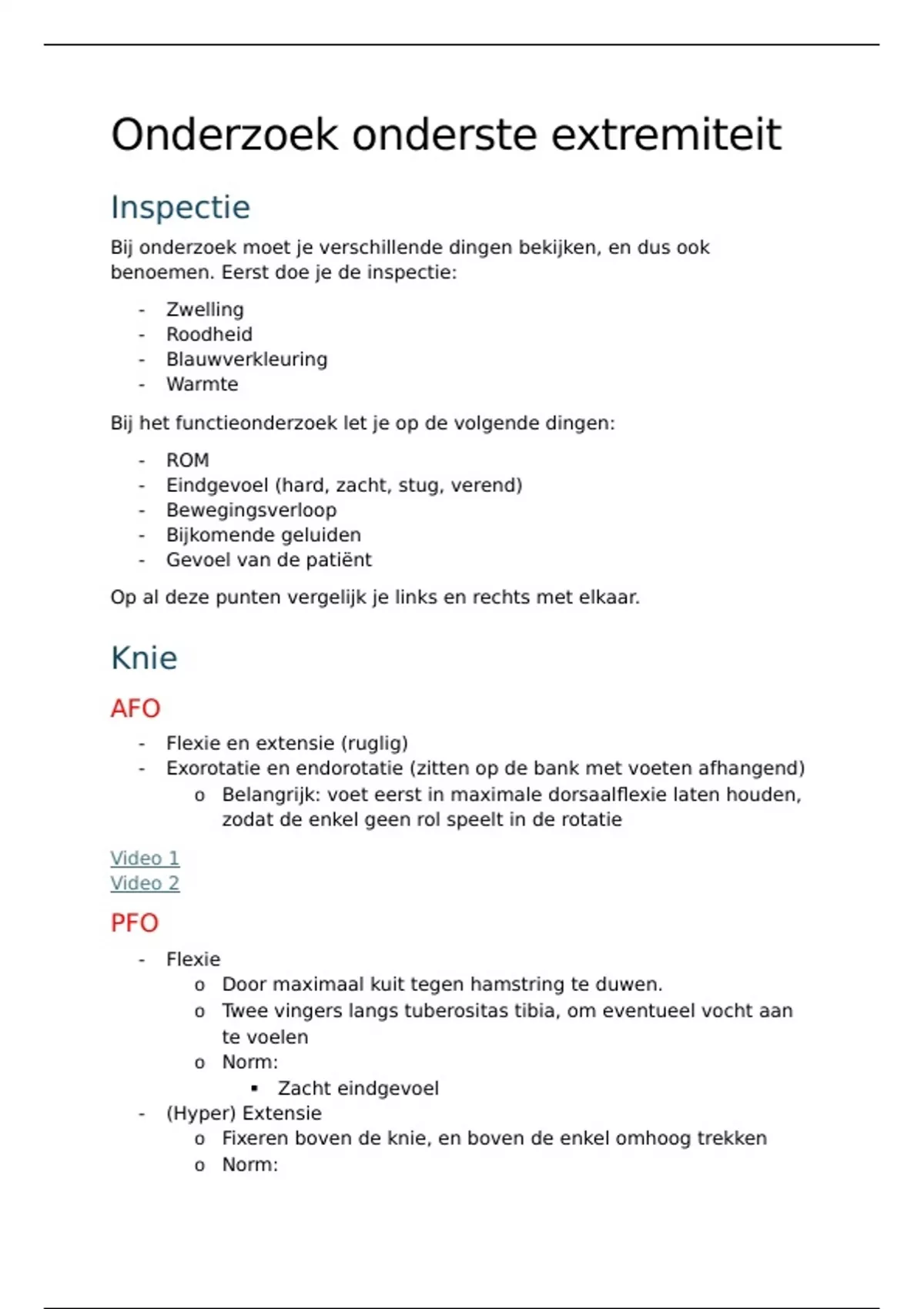 In dit document staan alle onderzoeken die je moet kunnen uitvoeren in de eerste periode van het eerste jaar Fysiotherapie aan Avans. Je kan de koppen makkelijk samenvouwen en zo per onderzoeksgroep alles openklikken.