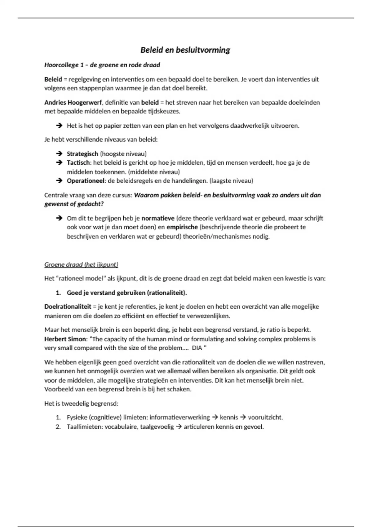 Het “rationeel model” als ijkpunt, dit is de groene draad en zegt dat beleid maken een kwestie is van:
