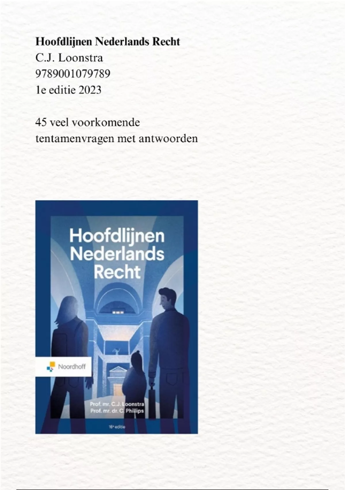 Hoofdlijnen Nederlands Recht - veel voorkomende tentamenvragen 45x met antwoorrden - C.J. Loonstra - 9789001079789 . Uit de 16e druk.