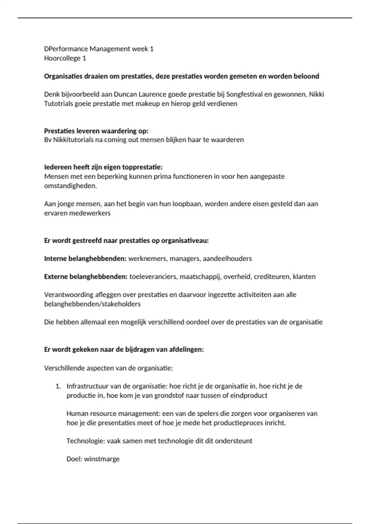 Dit document is een uitgebreide en praktische gids over Performance Management en biedt essentiële inzichten voor iedereen die betrokken is bij het verbeteren van prestaties binnen een organisatie. Het combineert theoretische concepten met praktijkgerichte voorbeelden en tools, waardoor het een waardevolle bron is voor managers, HR-professionals en consultants. Wat biedt het document? 1. Complete uitleg over Performance Management: o Definities, doelstellingen, en het belang voor organisaties. o Relatie met strategie, doelen en KPI's. 2. Tools en methoden voor prestatiemeting: o Gebruik van Balanced Scorecard, EFQM/INK-model en kritische succesfactoren. o Focus op effectiviteit en efficiëntie in prestaties. 3. Beoordeling en beloning: o Moderne en klassieke beoordelingssystemen. o Beloningsstrategieën en hun invloed op motivatie en prestaties. o Innovatieve methoden zoals 360-graden feedback en zelfevaluatie. 4. Praktische begeleiding voor gesprekken: o Plannings-, functionerings-, ontwikkelings- en beoordelingsgesprekken. o Gesprekscycli en tips om deze effectiever te maken. 5. Innovatie en duurzaamheid: o Agile werken in een VUCA-wereld. o Maatschappelijk verantwoord ondernemen (MVO) en duurzame inzetbaarheid. 6. Motivatie en werkbeleving: o Het creëren van een inspirerende werkomgeving. o Intrinsieke en extrinsieke motivatie. Voor wie is het bedoeld? • Managers: Voor betere sturing op prestaties en motivatie. • HR-professionals: Voor effectief prestatie- en talentmanagement. • Consultants: Voor het adviseren over strategisch en operationeel prestatiebeheer. • Organisaties: Die willen groeien door innovatie, duurzaamheid en betrokkenheid. Haal het maximale uit uw organisatie en medewerkers met dit allesomvattende document over Performance Management!