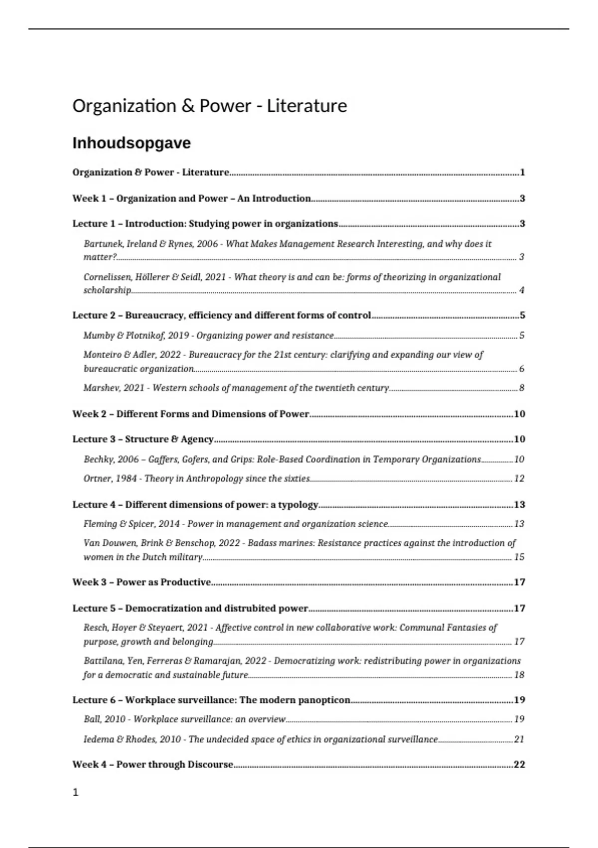 Uitgewerkte literatuur van het vak organization & Power