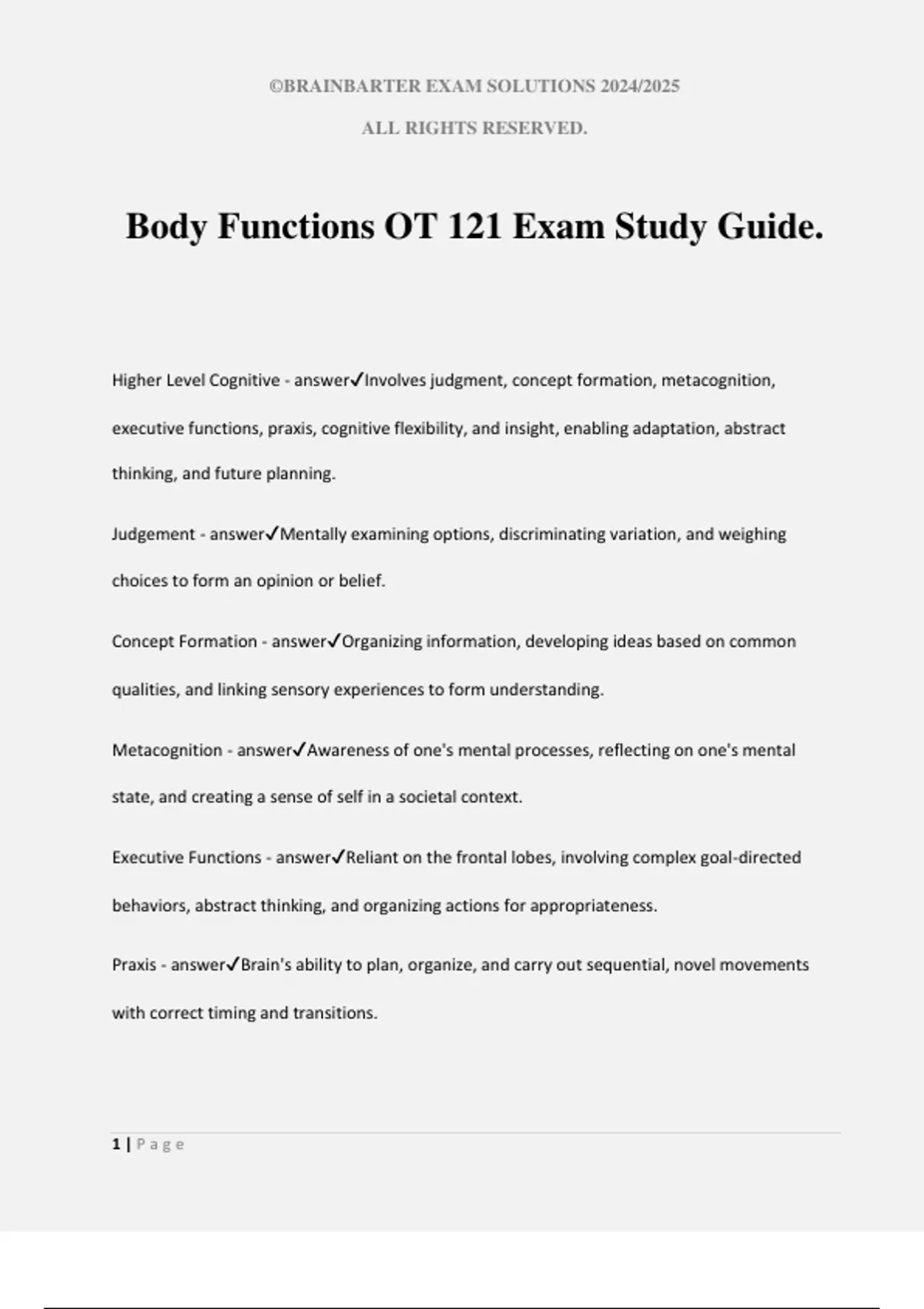 ©BRAINBARTER EXAM SOLUTIONS 2024/2025 ALL RIGHTS RESERVED. 1 | P a g e Body Functions OT 121 Exam Study Guide. Higher Level Cognitive - answerInvolves judgment, concept formation, metacognition, executive functions, praxis, cognitive flexibility, and insight, enabling adaptation, abstract thinking, and future planning. Judgement - answerMentally examining options, discriminating variation, and weighing choices to form an opinion or belief. Concept Formation - answerOrganizing information, developing ideas based on common qualities, and linking sensory experiences to form understanding. Metacognition - answerAwareness of one's mental processes, reflecting on one's mental state, and creating a sense of self in a societal context. Executive Functions - answerReliant on the frontal lobes, involving complex goal-directed behaviors, abstract thinking, and organizing actions for appropriateness. Praxis - answerBrain's ability to plan, organize, and carry out sequential, novel movements with correct timing and transitions.