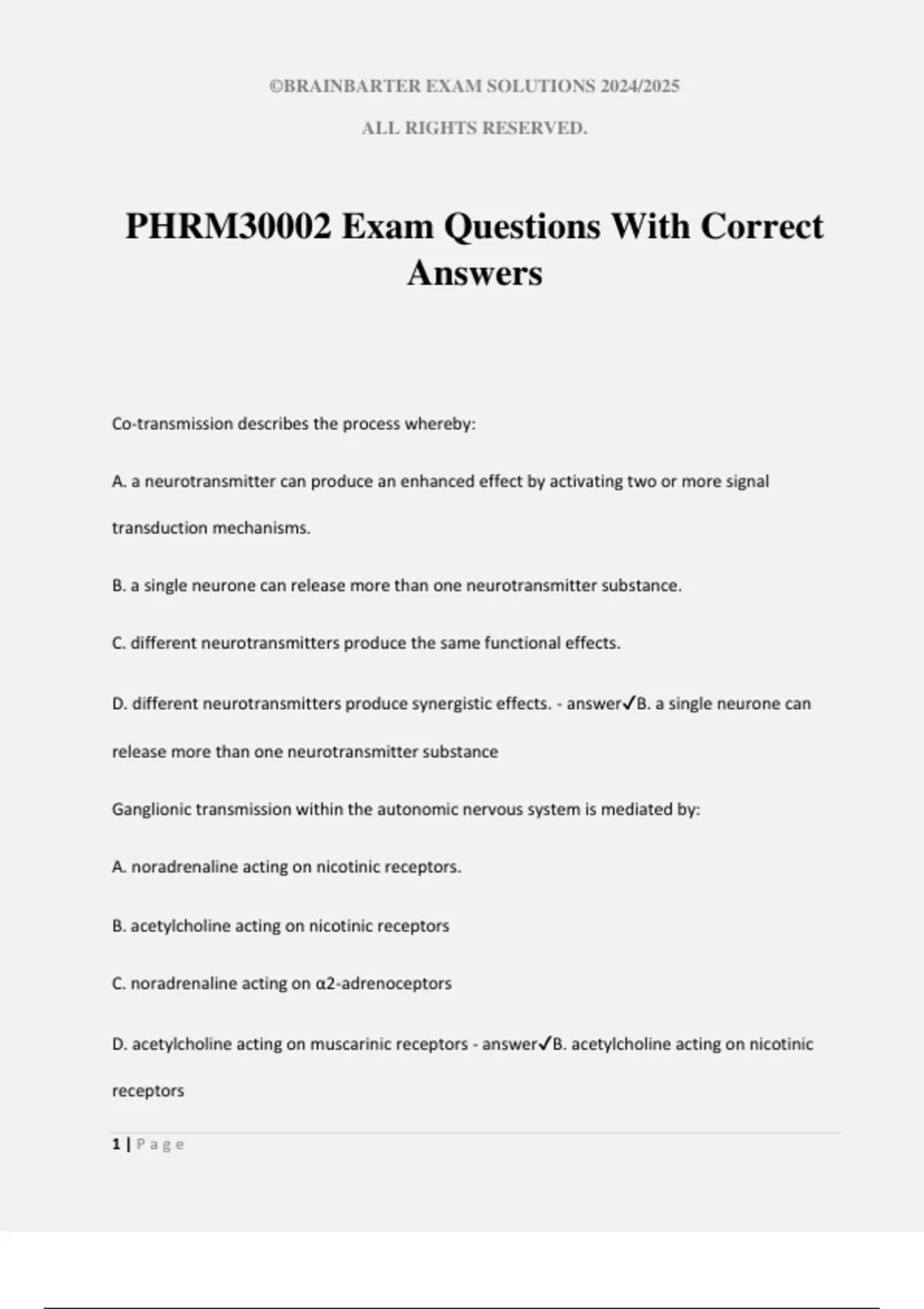 ©BRAINBARTER EXAM SOLUTIONS 2024/2025 ALL RIGHTS RESERVED. 1 | P a g e PHRM30002 Exam Questions With Correct Answers Co-transmission describes the process whereby: A. a neurotransmitter can produce an enhanced effect by activating two or more signal transduction mechanisms. B. a single neurone can release more than one neurotransmitter substance. C. different neurotransmitters produce the same functional effects. D. different neurotransmitters produce synergistic effects. - answerB. a single neurone can release more than one neurotransmitter substance Ganglionic transmission within the autonomic nervous system is mediated by: A. noradrenaline acting on nicotinic receptors. B. acetylcholine acting on nicotinic receptors C. noradrenaline acting on α2-adrenoceptors D. acetylcholine acting on muscarinic receptors - answerB. acetylcholine acting on nicotinic receptors