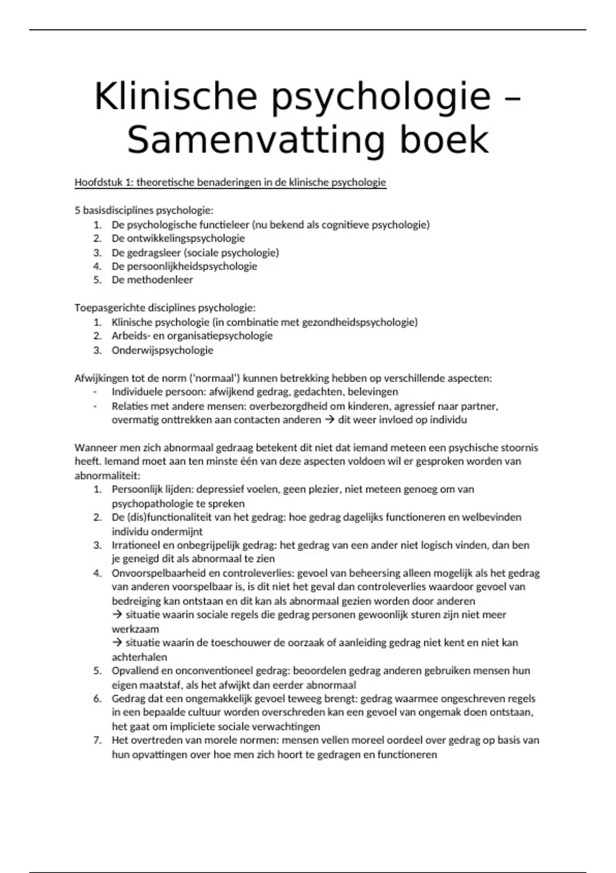 Dit is een volledige samenvatting voor het tentamen van het vak Klinische Psychologie. De samenvatting bevat een uitgebreid overzicht van H1 t/m H5, H7, H10, H12 t/m H19, H21, H23 t/m H25! Succes met leren :)