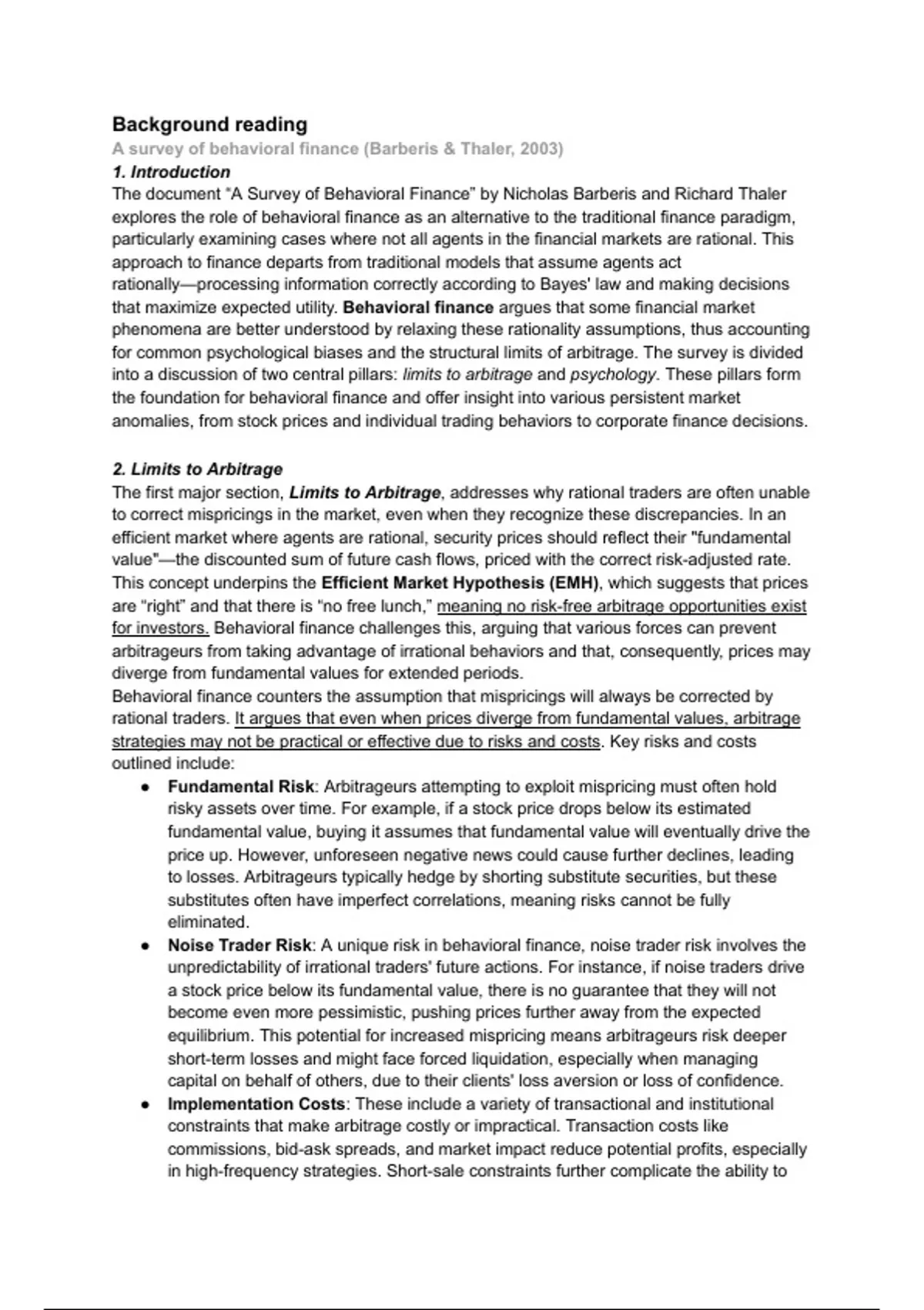 for common psychological biases and the structural limits of arbitrage. The survey is divided