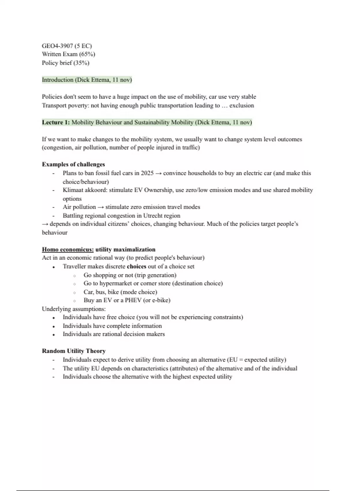 Lecture 1: Mobility Behaviour and Sustainability Mobility (Dick Ettema, 11 nov)