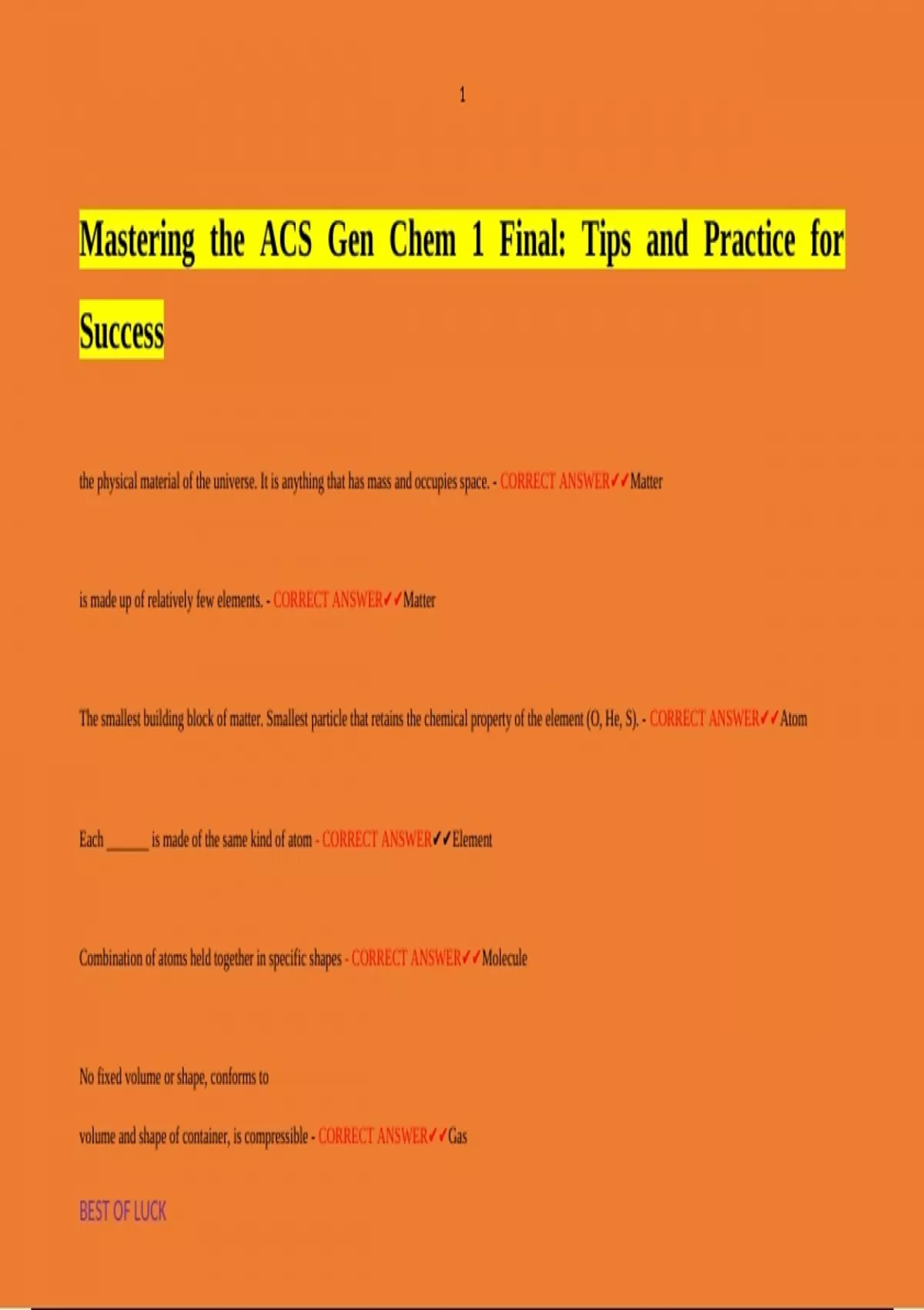 the physical material of the universe. It is anything that has mass and occupies space. - CORRECT ANSWERMatter is made up of relatively few elements. - CORRECT ANSWERMatter The smallest building block of matter. Smallest particle that retains the chemical property of the element (O, He, S). - CORRECT ANSWERAtom Each _______ is made of the same kind of atom - CORRECT ANSWERElement Combination of atoms held together in specific shapes - CORRECT ANSWERMolecule No fixed volume or shape, conforms to volume and shape of container, is compressible - CORRECT ANSWERGas Individual particles are confined to a given volume, liquid flows (no definite shape) and assumes the shape of its container up to the volume of the liquid, slightly compressible - CORRECT ANSWERLiquid Rigid with definite shape, very slightly compressible - CORRECT ANSWERSolid these stable diatomics - CORRECT ANSWERH2,O2, N2, and the Halogens (F2, Cl2, Br2, I2) Different samples of any pure compound contain the same elements in the same proportion by mass - CORRECT ANSWERLaw of Constant (Definite) Composition characteristics of a substance. Can be observed without changing a substance into another substance - CORRECT ANSWERPhysical Properties Describes the reactivity of a substance. Can only be observed when a substance is changed into another substance - CORRECT ANSWERChemical properties: Does not depend on amount. - CORRECT ANSWERIntensive property : Depends on amount. - CORRECT ANSWERExtensive property Substances transform into chemically different substances - CORRECT ANSWERChemical change No change in chemical composition - CORRECT ANSWERPhysical change How close to the true value a given measurement is. - CORRECT ANSWERAccuracy How well a number of independent measurements agree with one another. - CORRECT ANSWERPrecision Electrons were discovered by ______ in 1897, while Millikan's Oil Drop experiment determined its charge. • Neutrons were discovered by James Chadwick in 1932. - CORRECT ANSWERJ.J. Thompson