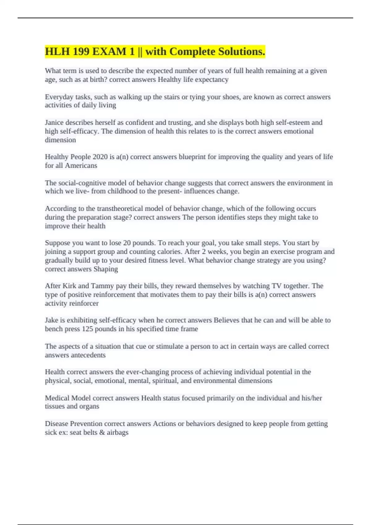 What term is used to describe the expected number of years of full health remaining at a given age, such as at birth? correct answers Healthy life expectancy Everyday tasks, such as walking up the stairs or tying your shoes, are known as correct answers activities of daily living Janice describes herself as confident and trusting, and she displays both high self-esteem and high self-efficacy. The dimension of health this relates to is the correct answers emotional dimension Healthy People 2020 is a(n) correct answers blueprint for improving the quality and years of life for all Americans The social-cognitive model of behavior change suggests that correct answers the environment in which we live- from childhood to the present- influences change. According to the transtheoretical model of behavior change, which of the following occurs during the preparation stage? correct answers The person identifies steps they might take to improve their health Suppose you want to lose 20 pounds. To reach your goal, you take small steps. You start by joining a support group and counting calories. After 2 weeks, you begin an exercise program and gradually build up to your desired fitness level. What behavior change strategy are you using? correct answers Shaping After Kirk and Tammy pay their bills, they reward themselves by watching TV together. The type of positive reinforcement that motivates them to pay their bills is a(n) correct answers activity reinforcer Jake is exhibiting self-efficacy when he correct answers Believes that he can and will be able to bench press 125 pounds in his specified time frame The aspects of a situation that cue or stimulate a person to act in certain ways are called correct answers antecedents Health correct answers the ever-changing process of achieving individual potential in the physical, social, emotional, mental, spiritual, and environmental dimensions Medical Model correct answers Health status focused primarily on the individual and his/her tissues and organs Disease Prevention correct answers Actions or behaviors designed to keep people from getting sick ex: seat belts & airbags